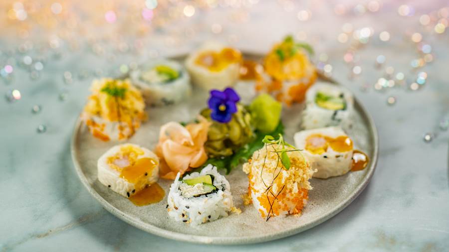 - The California Grill Sushi Classics Trio – Blue Crab California Roll, Shrimp Tempura Roll, Spicy Kazan Roll – brings together three of the most popular rolls on one plate. The Spicy Kazan Roll with blue crab, yellowfin tuna tataki, and sweet shrimp is sure to be a favorite. What makes this sushi roll unique is the Fireball Sauce with bay scallops, avocado, and mango, bringing the flavor to another level.