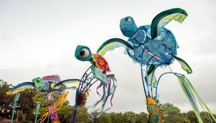 Characters from A Bug’s Life, Moana, Pocahontas, and more fill the seating area in wonderful kite form, before a pre-show begins featuring characters from Finding Nemo and The Little Mermaid.