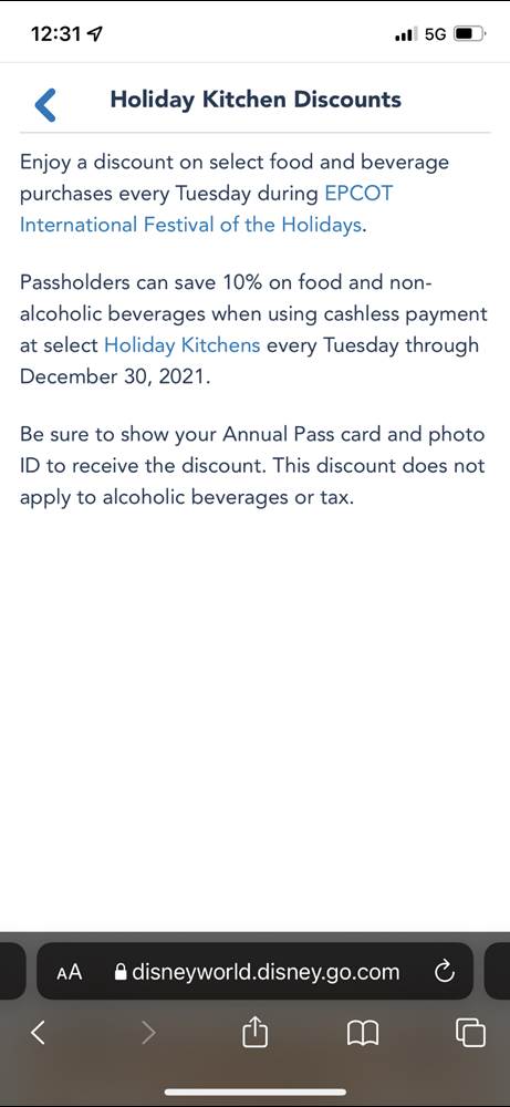 - Annual Passholders visiting the EPCOT International Festival of the Holidays on Tuesdays will receive a 10% discount on select food and non-alcoholic beverages at select Holiday Kitchens.