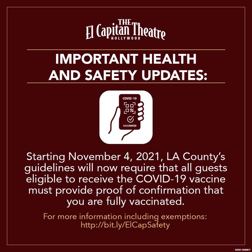 - Beginning November 4, the El Capitan Theater will require that all guests eligible to receive the COVID-19 vaccine must provide proof of confirmation that they are fully vaccinated, in accordance with a new Los Angeles City Ordinance.