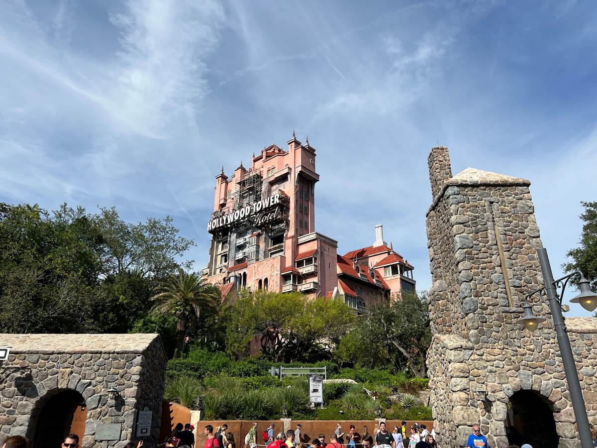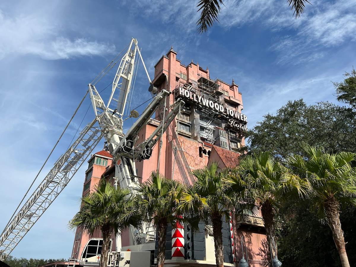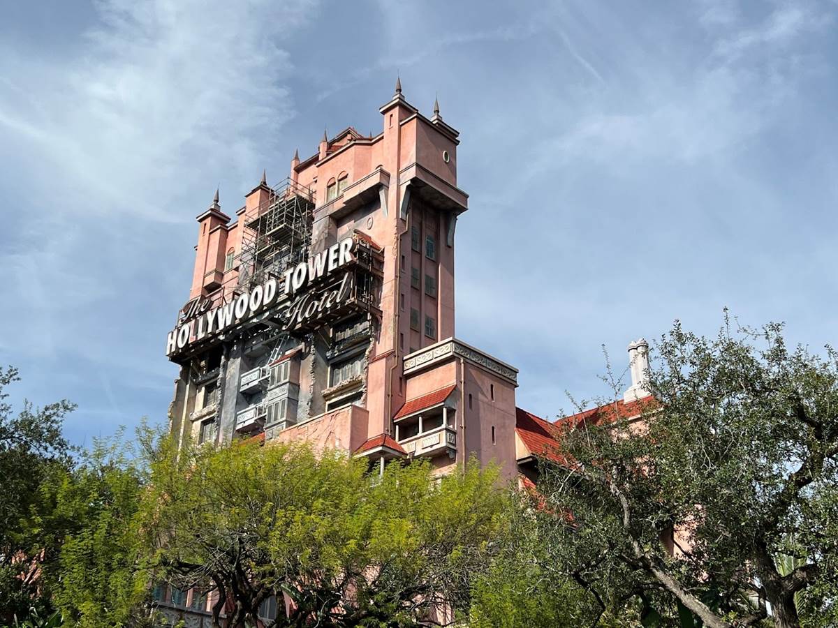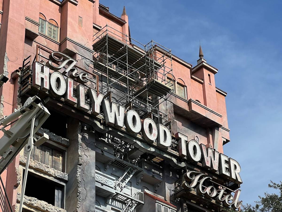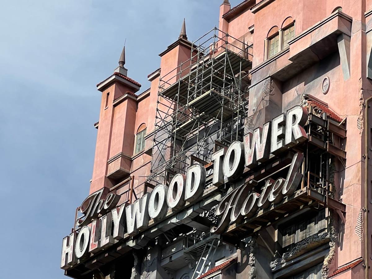 We’ll start off at The Twilight Zone Tower of Terror, where scaffolding has been erected around the famous Hollywood Tower Hotel marquee.