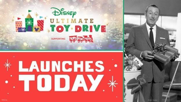 - Now through this December 14, families and fans can join the Disney Ultimate Toy Drive and give back to those who need it most this holiday season by donating a toy online at shopDisney.com or donating a new, unwrapped toy in person at Downtown Disney District at Disneyland Resort or Disney Springs at Walt Disney World.