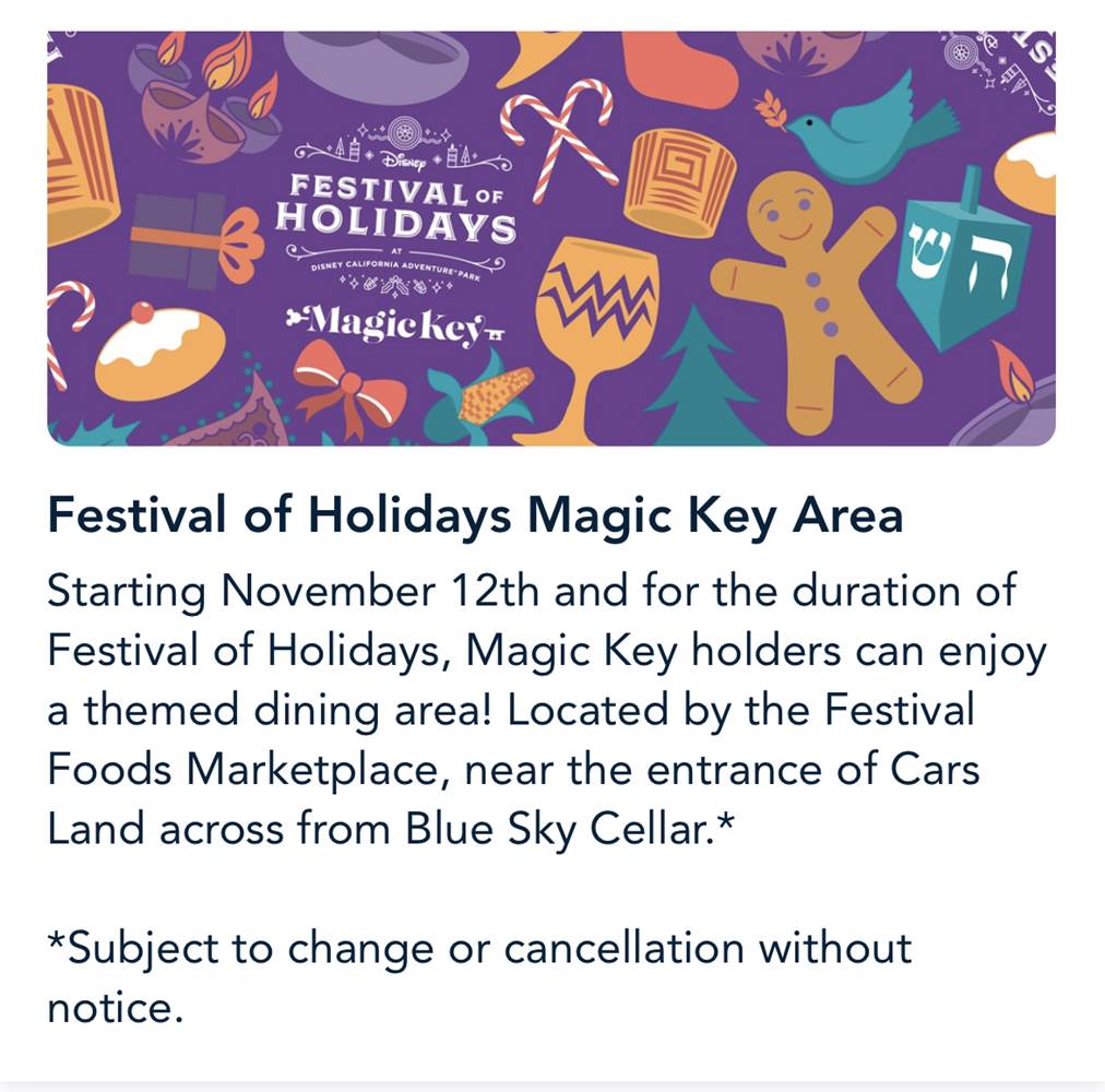 - Starting November 12, continuing through the duration of Festival of Holidays, Magic Key holders can enjoy a special themed dining area. It will be located near the entrance to Cars Land by the Festival Foods Marketplace.