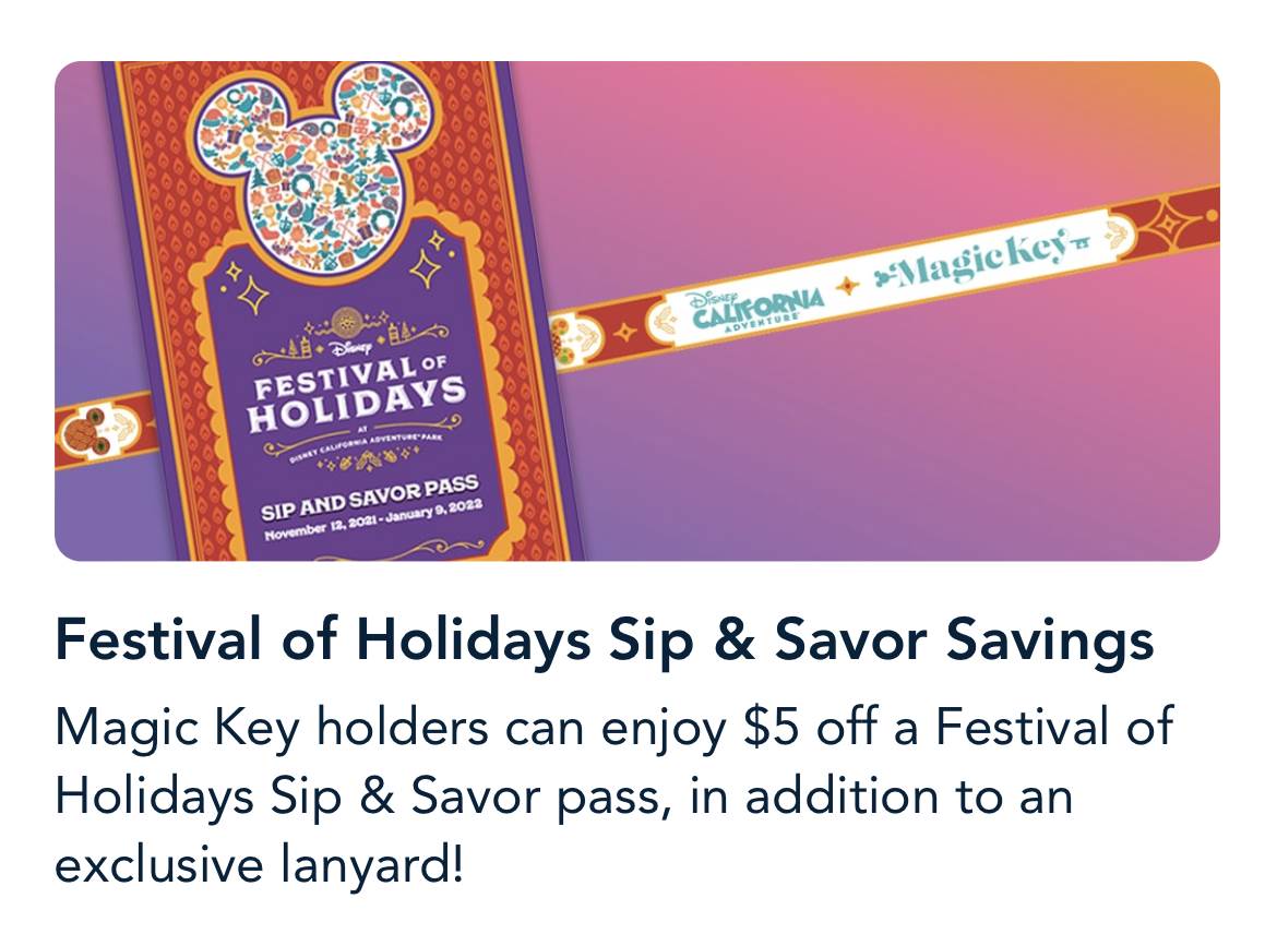 - Magic Key holders will also be able to receive $5 off a Festival of Holidays Sip & Savor pass, which comes with an exclusive lanyard.