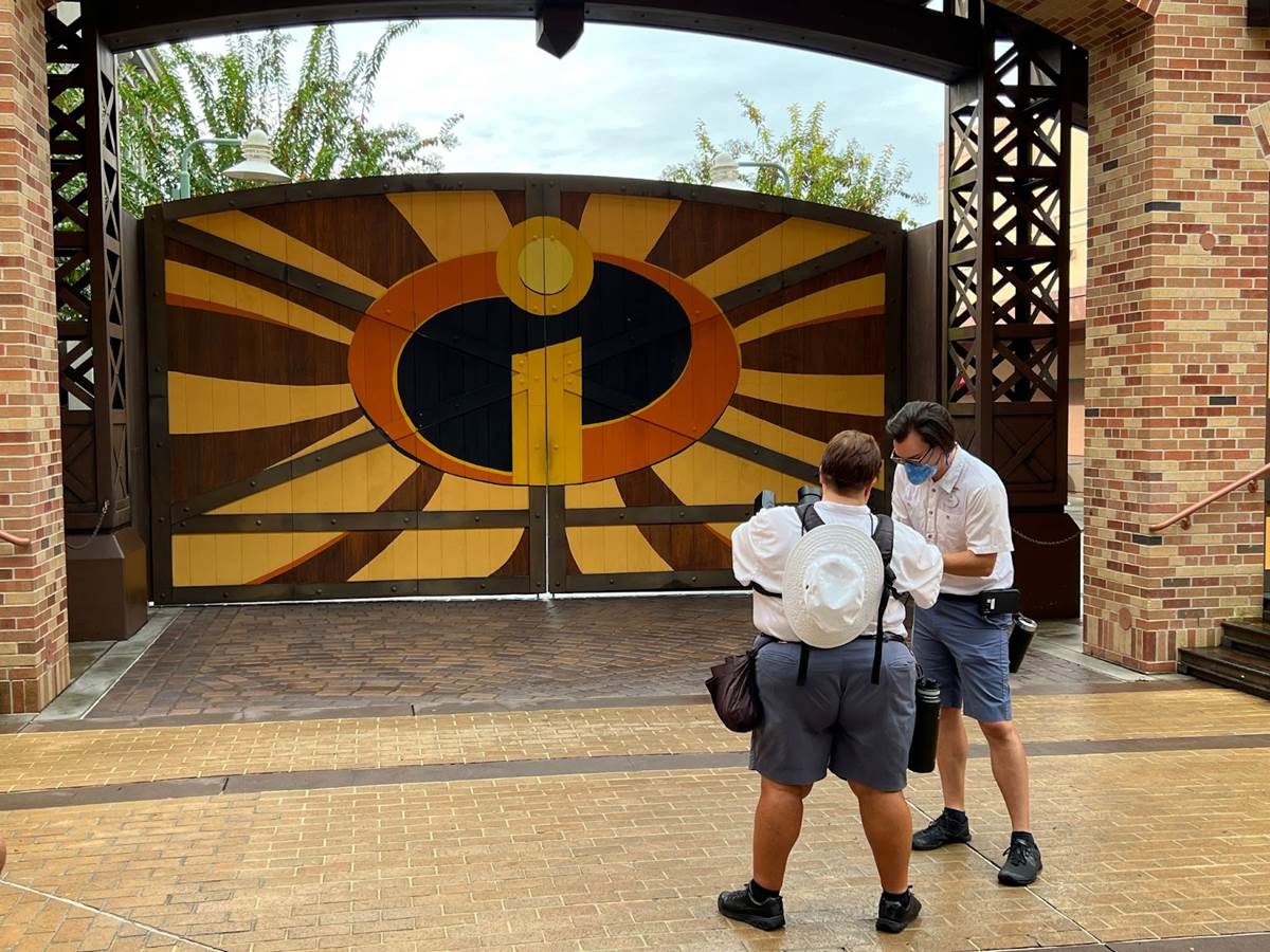 PhotoPass cast members setting up a special MagicShot available in the Incredibles Metroville area.