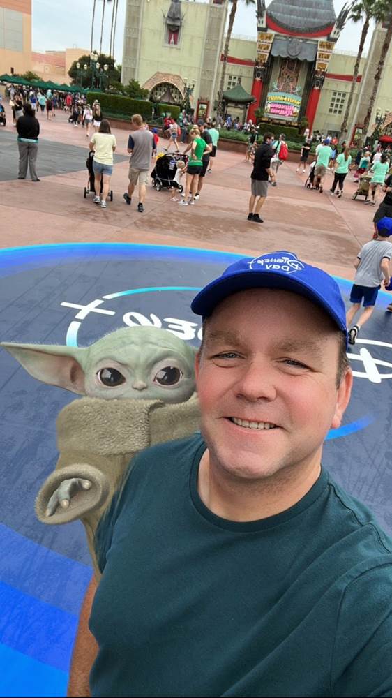 Jeremiah took a selfie with Grogu, which anyone can do today through the My Disney Experience app.