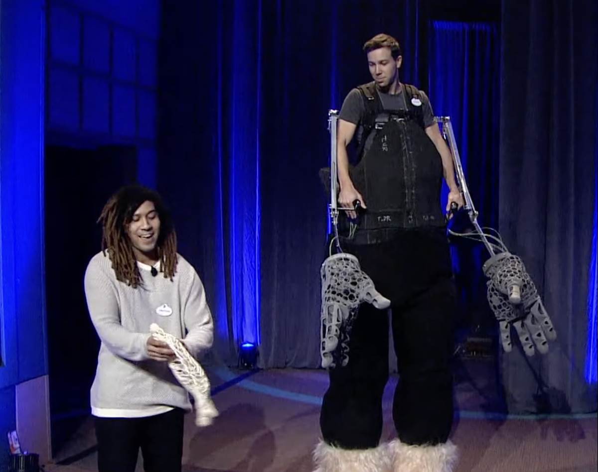- Two Imagineers showcased Project Exo, a large exoskeleton made of 3-D printed materials that is lightweight and safer for performers. The full body weight of the piece is shifted to the ground making it easier on the performer's backs and shoulders.