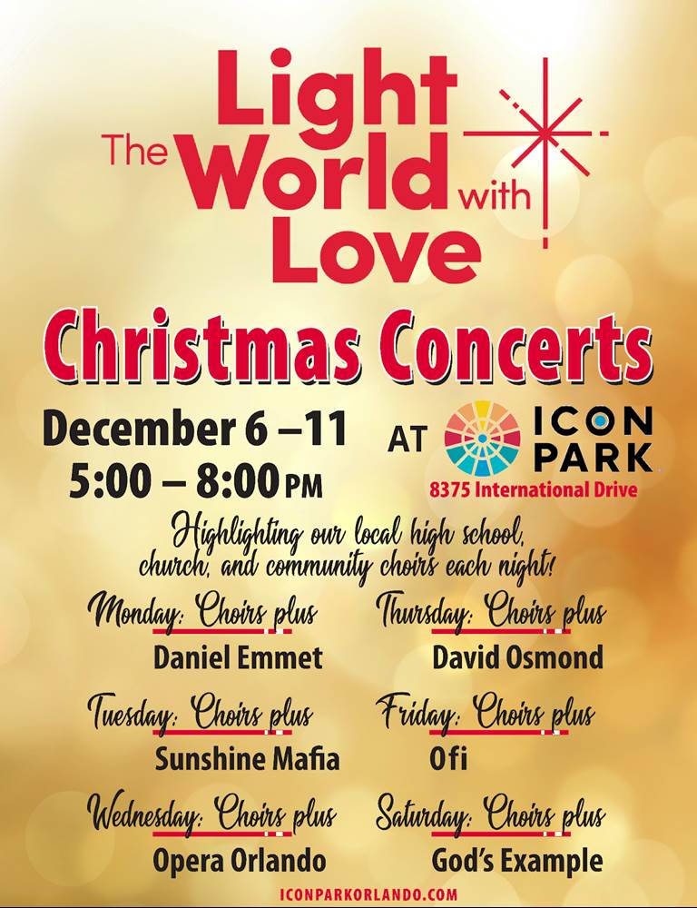 - Chris Jaskiewicz, president and CEO of ICON Park said: “At ICON Park, we’re all about showing locals and visitors alike what Orlando is all about. The Light the World with Love Christmas Concerts are a perfect way for us to show off the talent here in Orlando, as well as to give back to the community we care about so much—plus, who couldn’t use a dose of the Christmas spirit?”