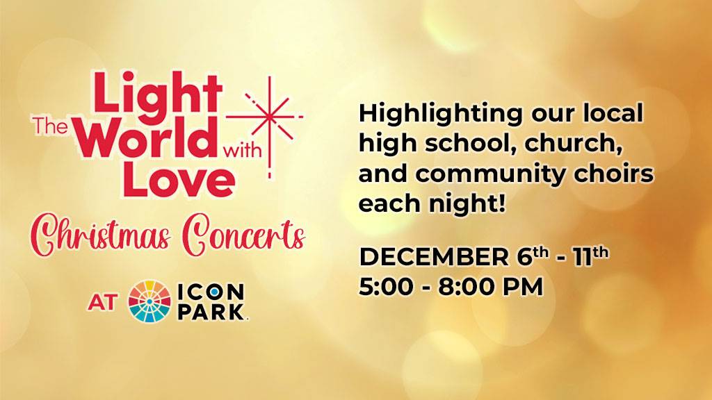 - From December 6th through 11th, ICON Park will be hosting performances from local high school, church, and community choirs nightly from 5PM through 8PM.