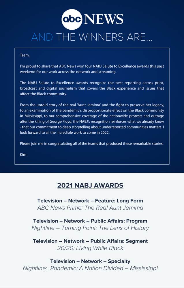 - ABC News won four NABJ (National Association of Black Journalists) Salute to Excellence awards this past weekend for their work across network and streaming.