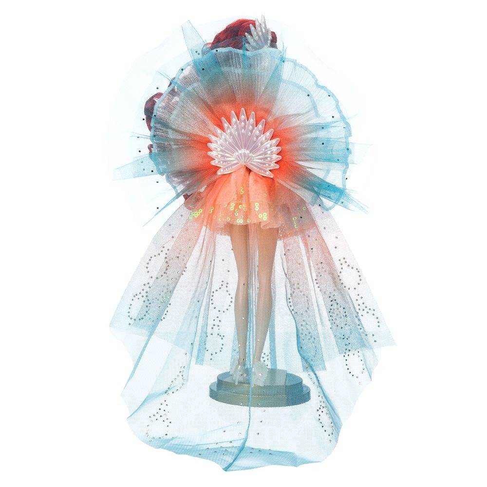 - Tulle and pleated organza layered backpiece evoking the crash of the waves