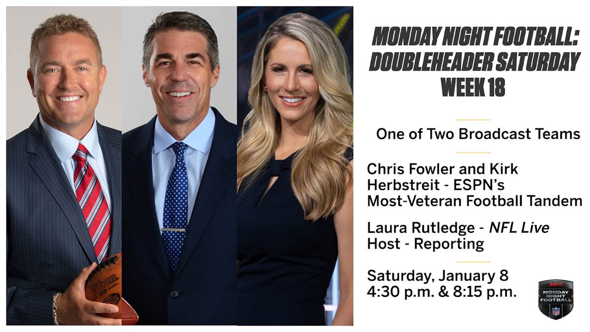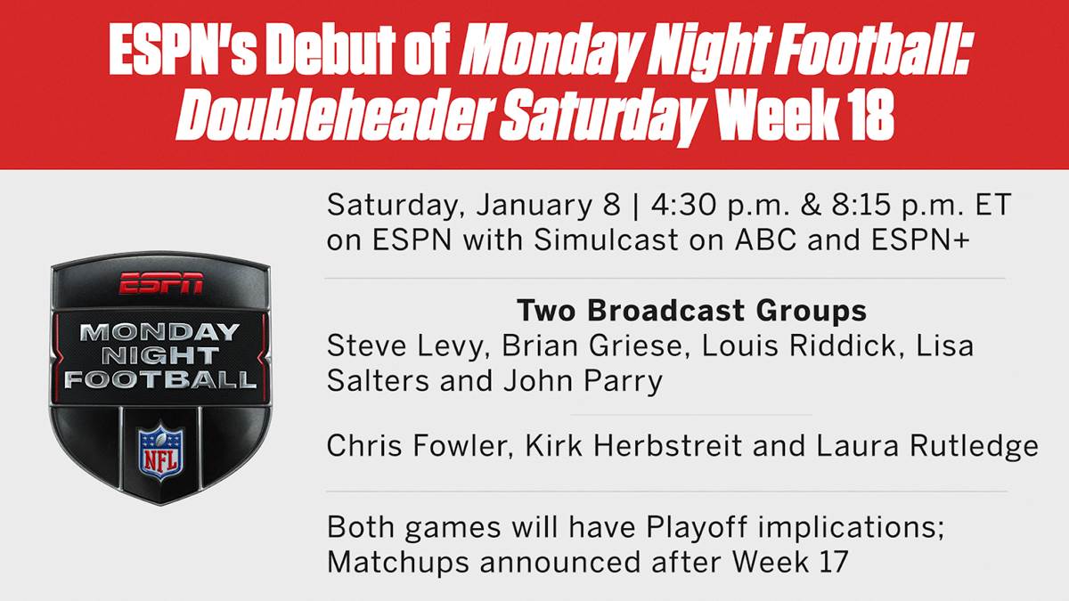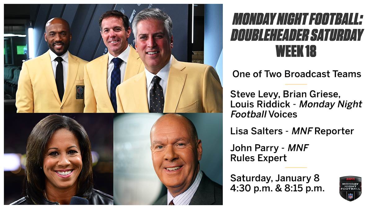 - ESPN will have two broadcast booths for Monday Night Football: Doubleheader Saturday. The voices of Monday Night Football – Steve Levy, Brian Griese, Louis Riddick, Lisa Salters and John Parry – will call one game, as the group concludes their second regular season and prepares to call ESPN’s NFL Super Wild Card game.
