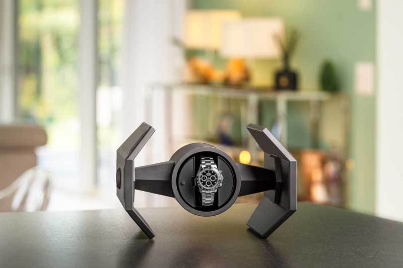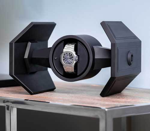 The TIE Advanced x1 Watch Winder will keep their timepiece up to speed in style. Each winding engine has been directly integrated into a solid aluminum sculpture, inspired by the TIE Advanced x1 starfighter, piloted by Lord Darth Vader himself in the film Star Wars: A New Hope. Each is made of solid black anodized aluminum, fully machined, hand-finished, and assembled in-house by Kross Studios. The Star Wars-inspired watch winders harness the force via powerful movement to maintain the mechanism of any automatic mechanical watch placed within the winding capsule.