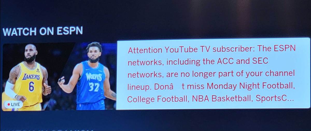 - Due to a failure to reach an agreement by last night’s Midnight ET deadline, Disney networks like ESPN, ABC, Freeform, and even FX, are no longer available on Youtube TV.