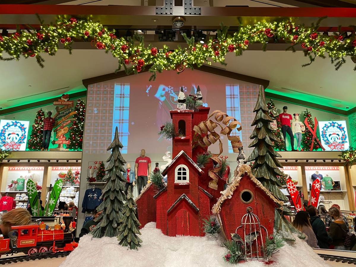 The “Walt’s Holiday Lodge” inspired holiday decor inside World of Disney is fantastic.