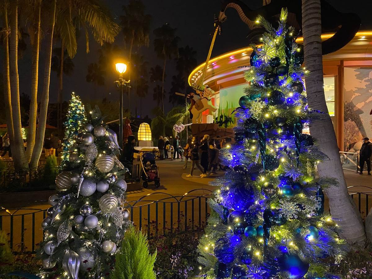 Christmas trees decorate most of the planters throughout Downtown Disney.