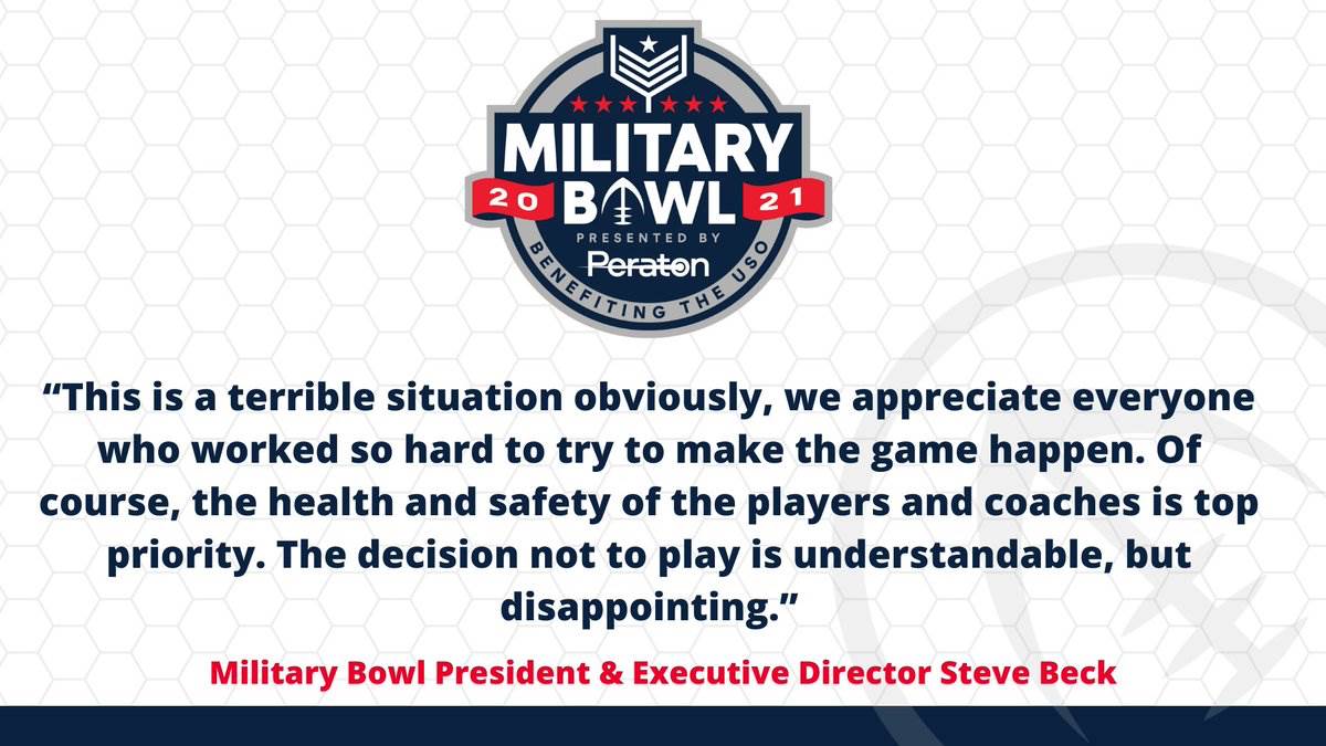 - Military Bowl President & Executive Director Steve Beck: “This is a terrible situation obviously. We appreciate everyone who worked so hard to try to make the game happen. Of course, the health and safety of the players and coaches is top priority. The decision not to play is understandable, but disappointing…The Military Bowl Foundation’s mission is to raise funds for and support the nation’s service members. The Bowl is a big part of this, so it is devastating to think that it could impact our ability to make a positive difference for those who serve our nation.”