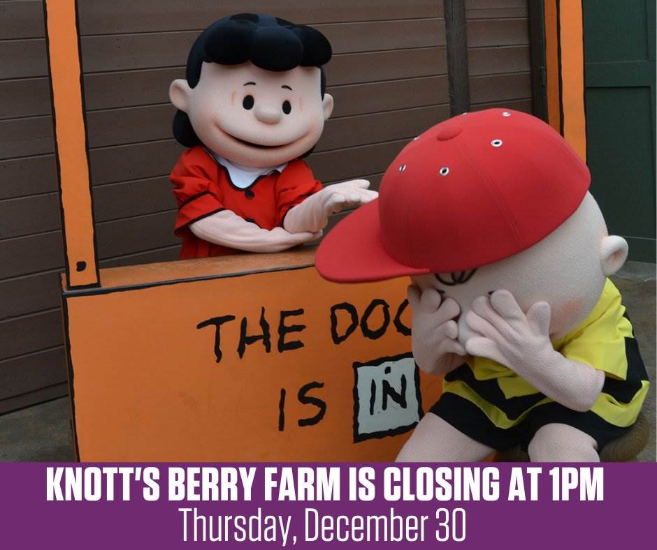 - At Knott’s Berry Farm, the park will close at 1 PM but the Marketplace outside the park will remain open today until 7 PM.