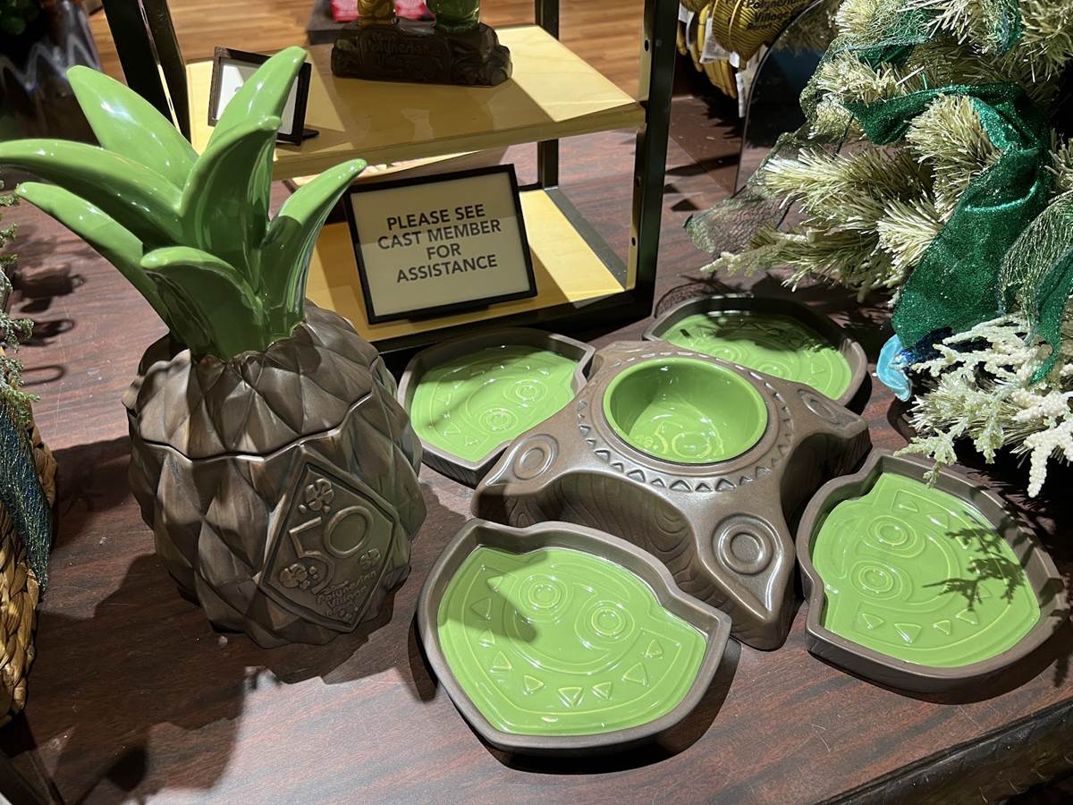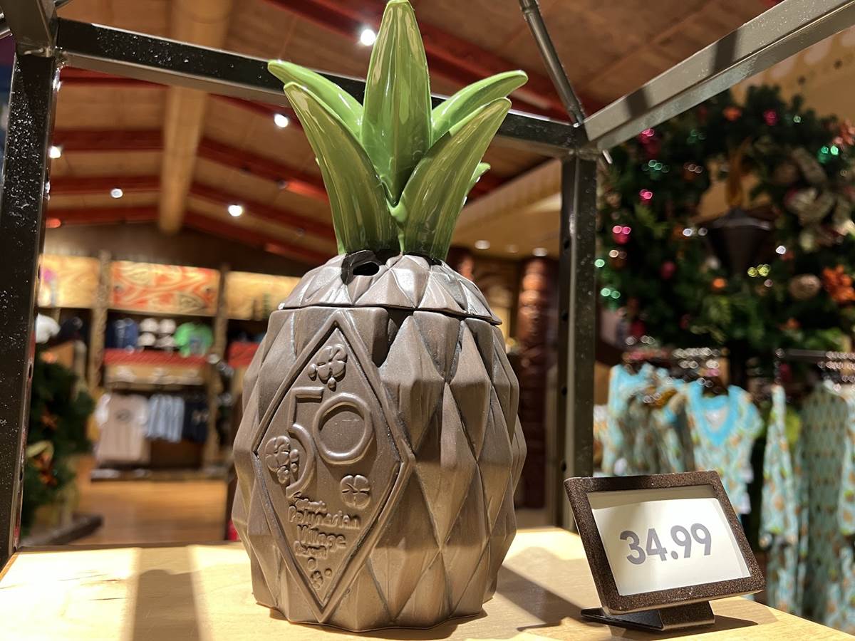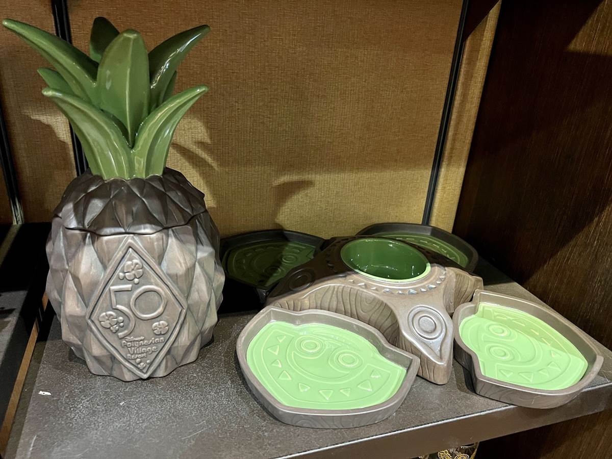 Stealing the show of the shelves is a 7 piece “hospitality set,” featuring dishes and a serving bowl and accompanying pineapple drink container. All of which is beautifully adorned with the tiki god Maui, as well as the 50th emblem. The set retails for $99.99