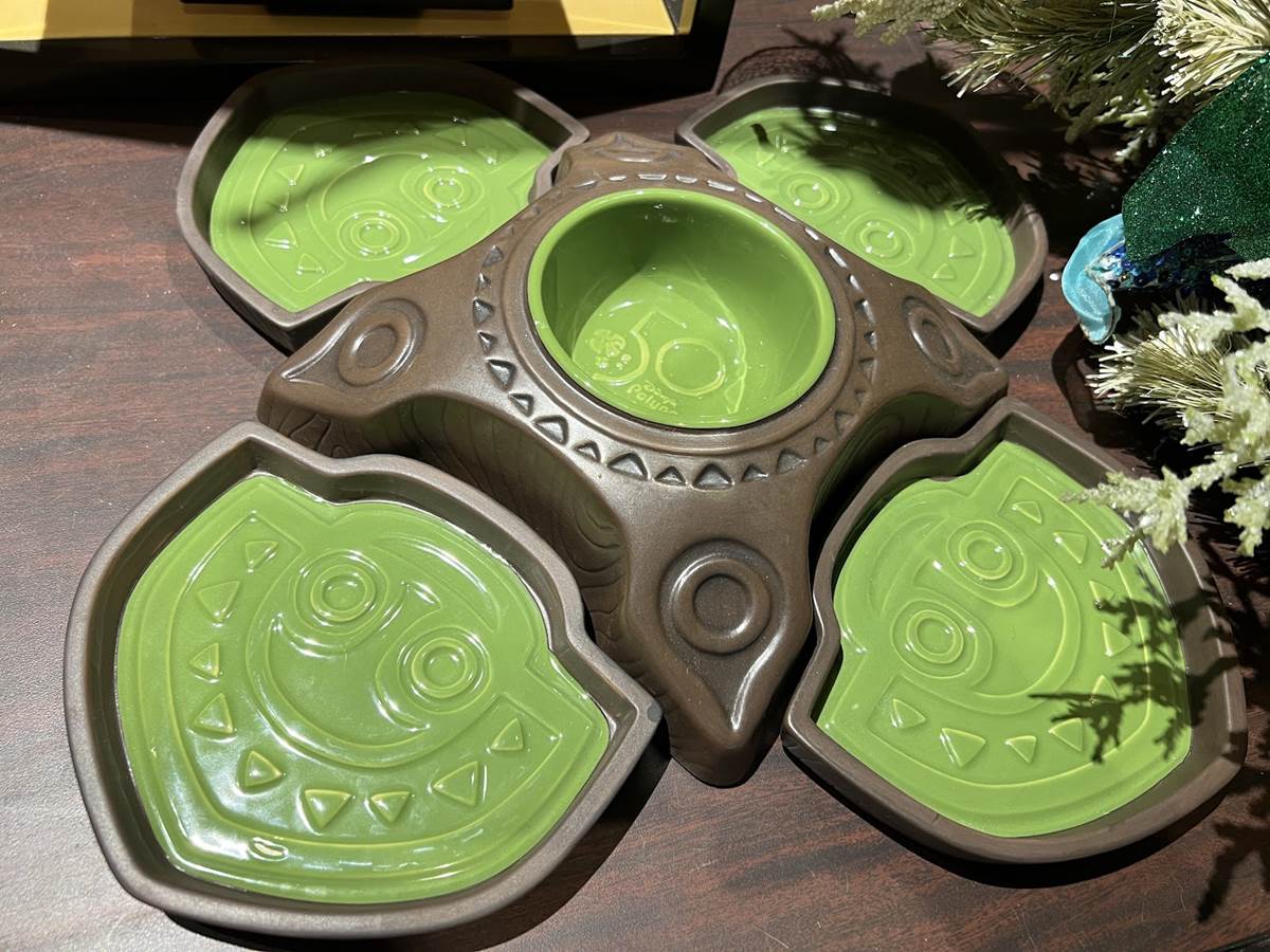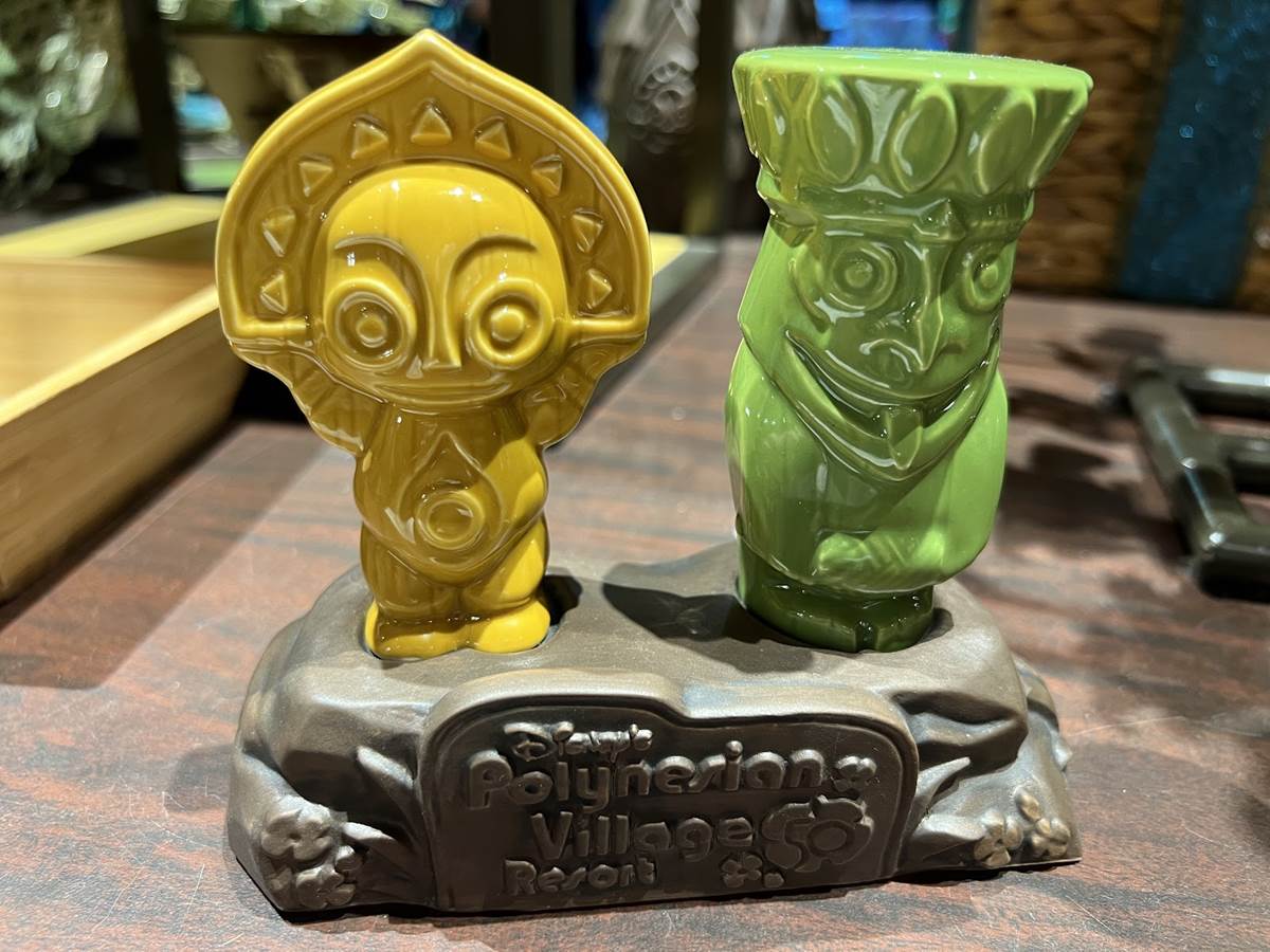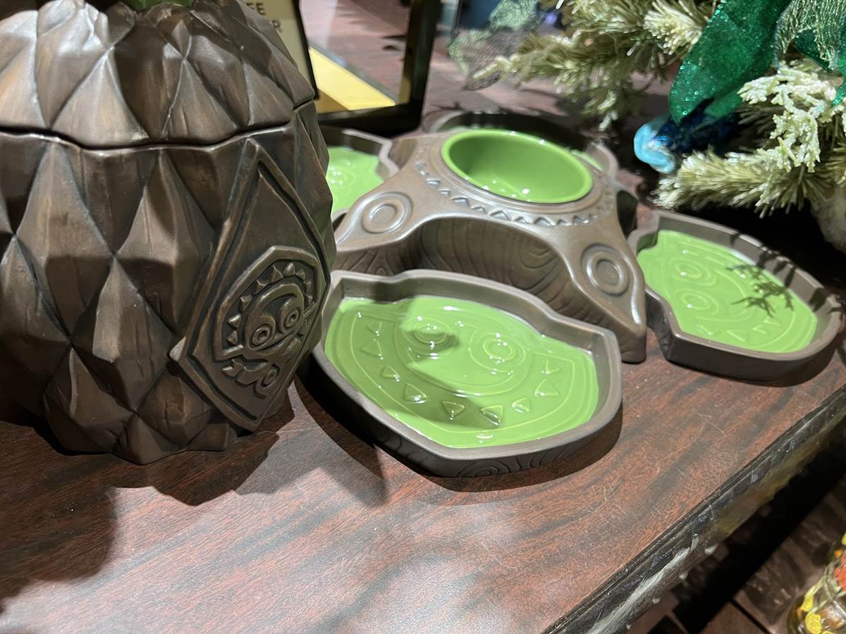 Stealing the show of the shelves is a 7 piece “hospitality set,” featuring dishes and a serving bowl and accompanying pineapple drink container. All of which is beautifully adorned with the tiki god Maui, as well as the 50th emblem. The set retails for $99.99