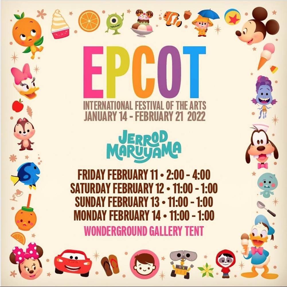 Jerrod Maruyama, a featured artist at this year’s EPCOT International Festival of the Arts, posted his schedule on Instagram of the days he will be at the festival’s Wonderground Gallery Tent.