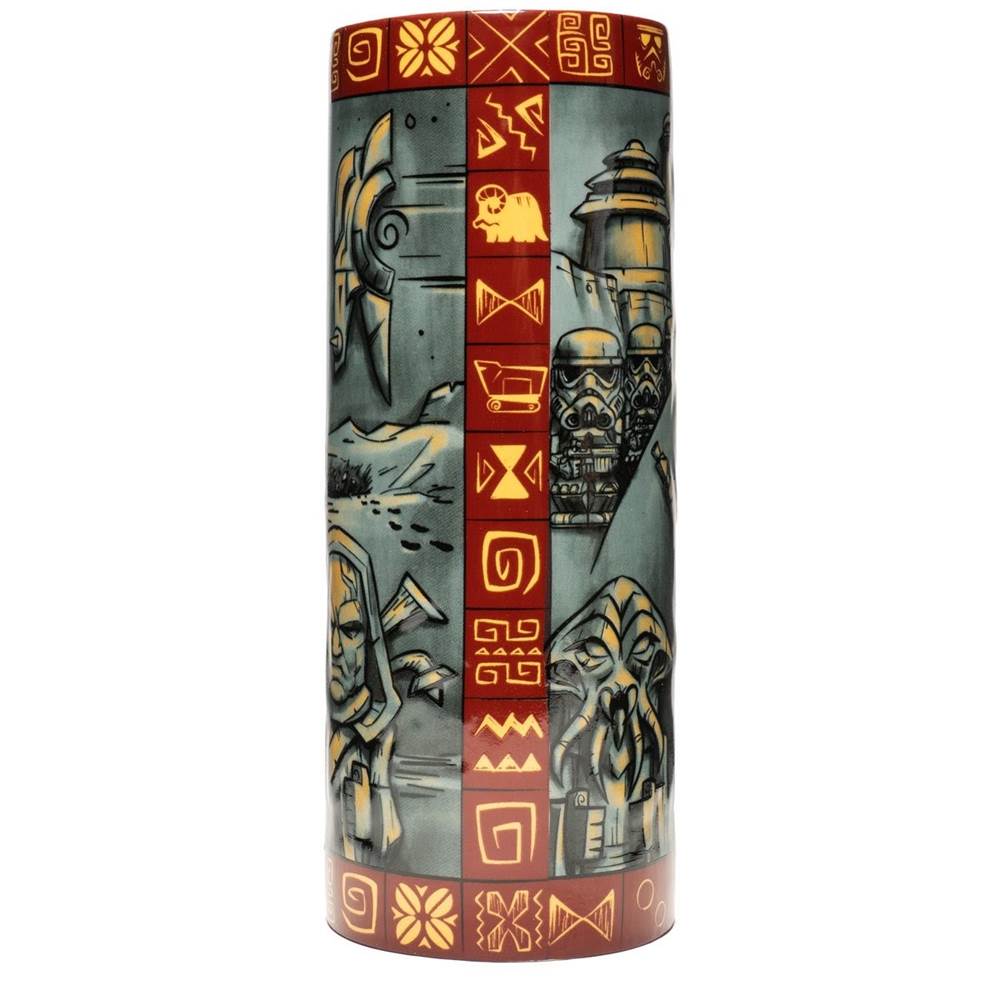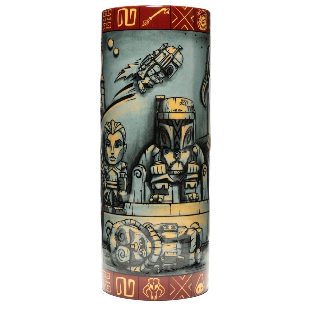 - The upper rim and base are decorated with tiki style symbols, Boba’s Tusken Raider staff, the Mythosaur icon, a bantha, a sandcrawler and more.