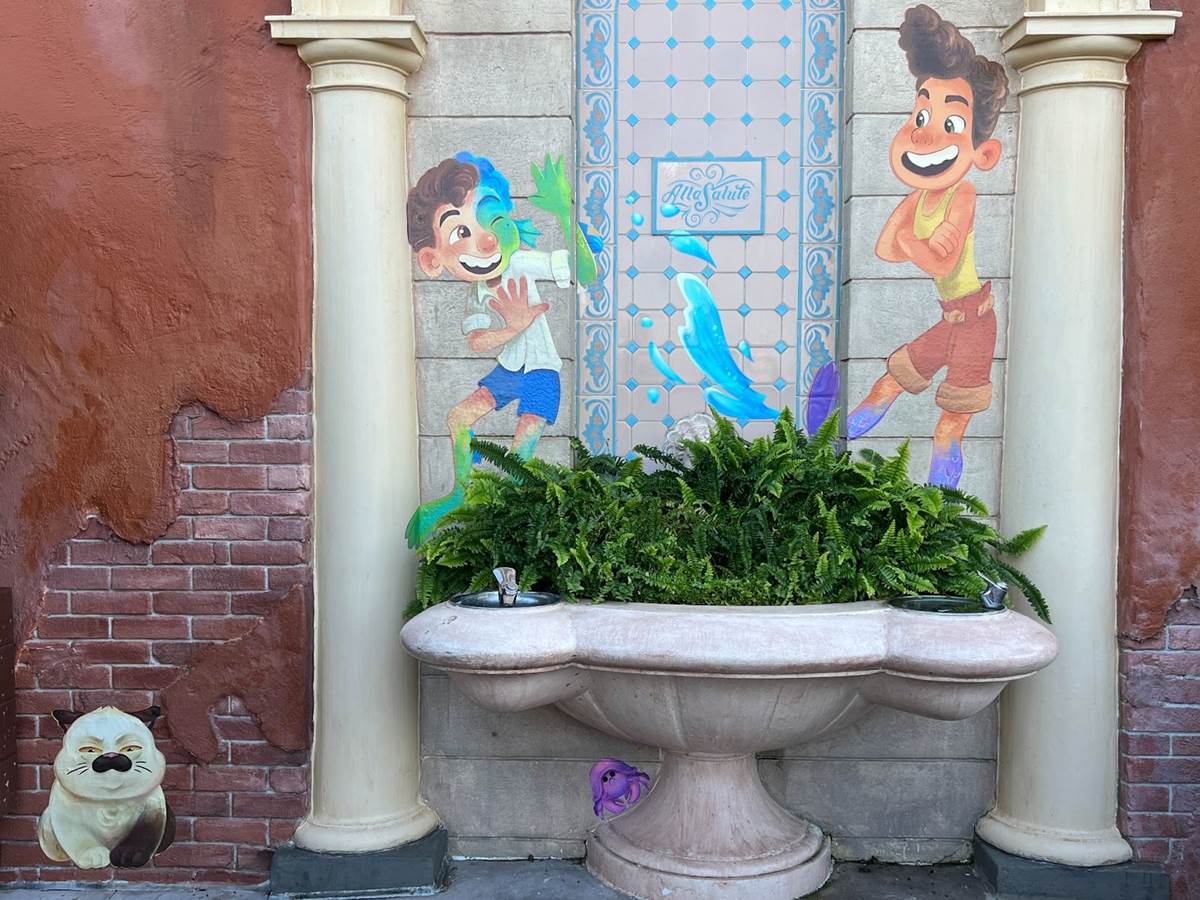 A new addition this year are the friends Luca and Alberto from Pixar’s Luca, masterfully worked into this faux fountain in Italy.