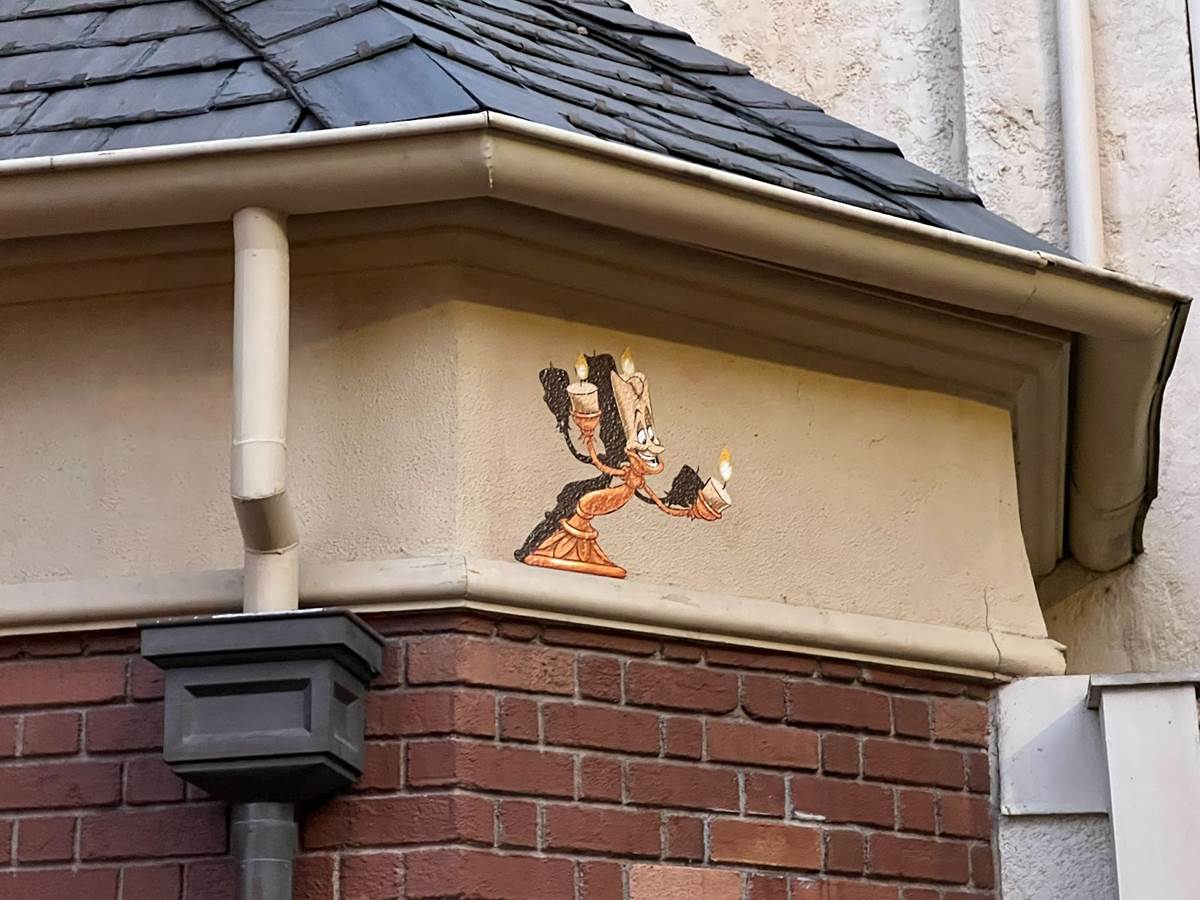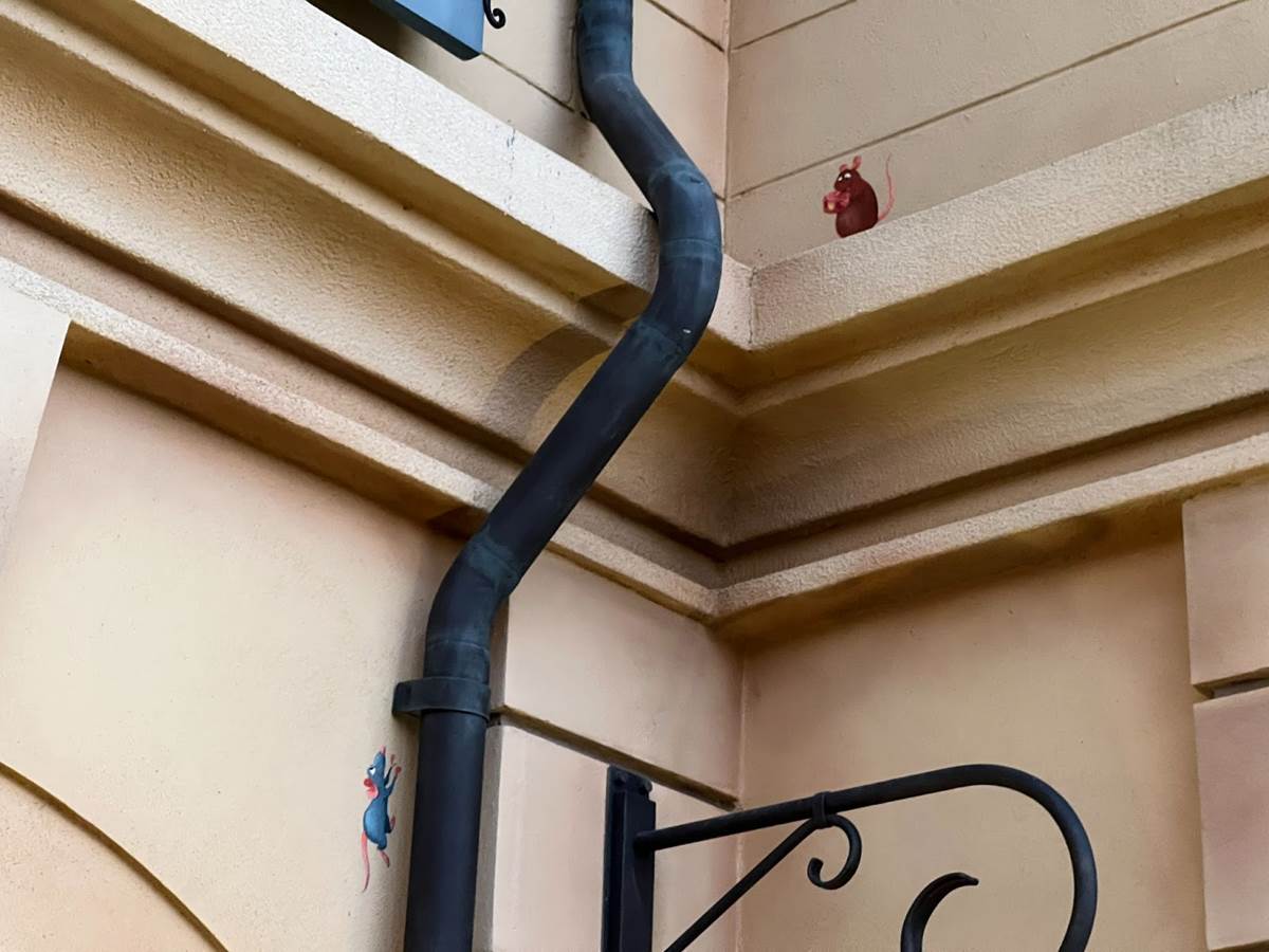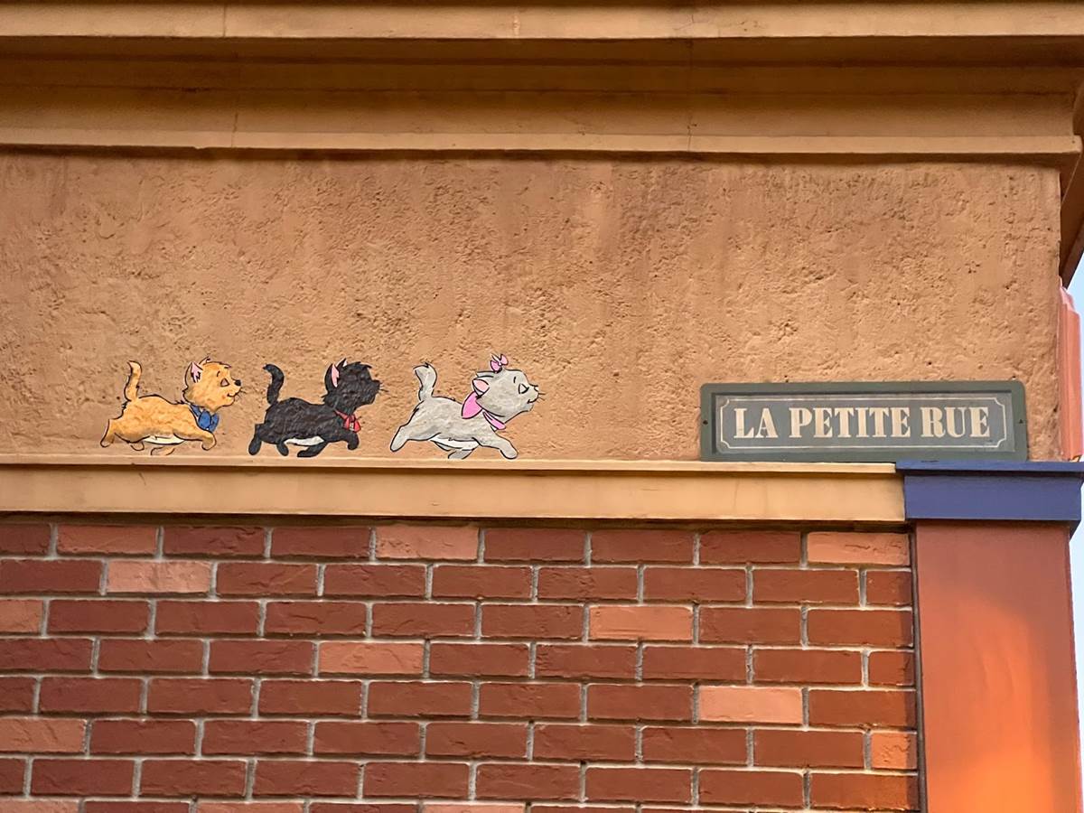 The France pavilion features Duchess’s three kittens from the 1970 classic, The Aristocats. Berlioz, Toulouse, and Marie can be seen on the edge of a building near La Petite Rue.