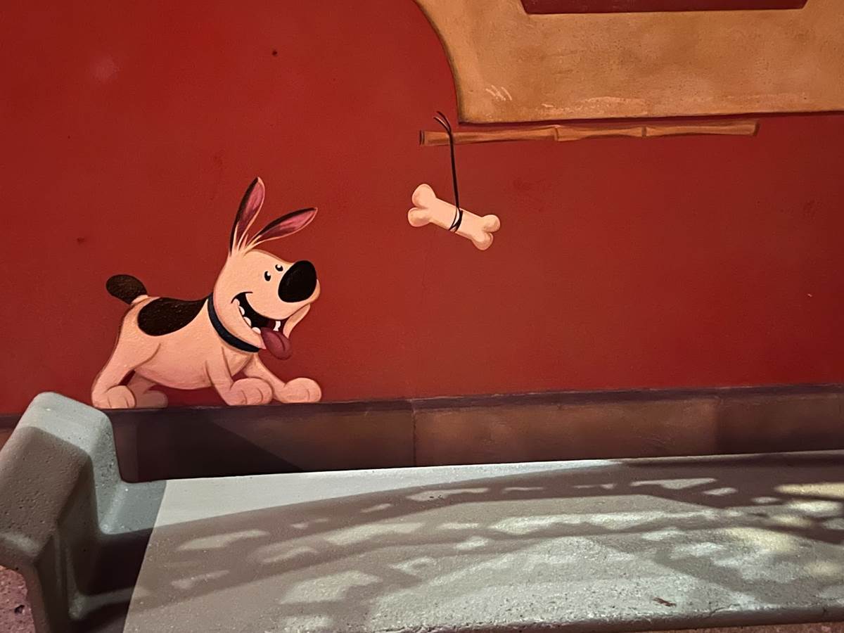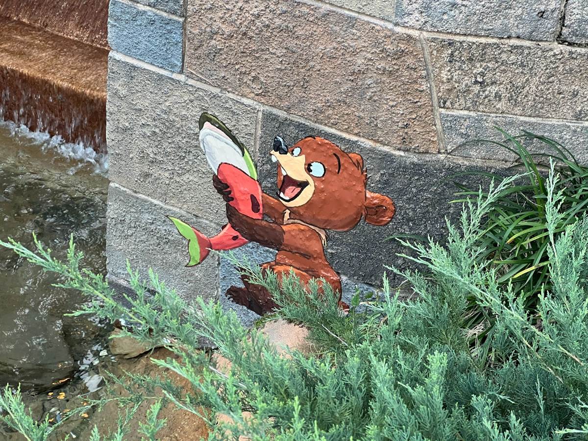Further down the promenade, we can find Koda the bear from 2004’s Brother Bear catching some salmon under the bridge of the Canada pavilion, though his older counterpart Kenai is nowhere to be found.