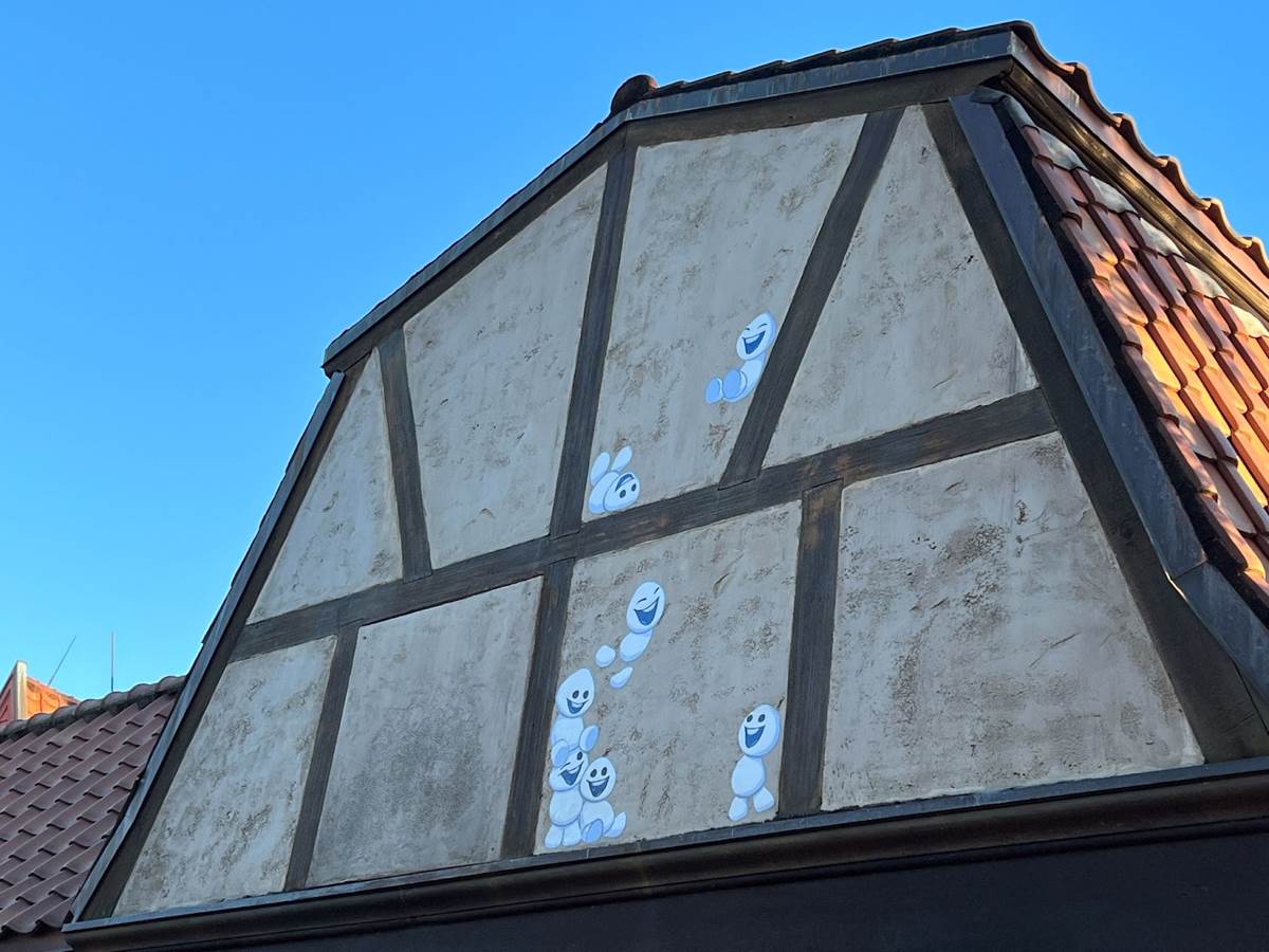 Snowgies from the animated short Frozen Fever can be found adorning the sides of the buildings of the Norway pavilion near the Somerhaus meet and greet area for Anna and Elsa.