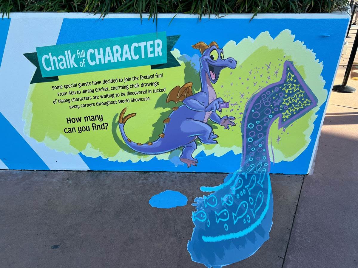 The EPCOT International Festival of the Arts begins tomorrow, and preparation has been underway to get EPCOT looking its artistic best. Jeremiah was at the park today and shared some photos of “Chalk Full of Characters,” where guests are encouraged to find charming chalk drawings of Disney characters through the pavilions, some more obvious than others, as they explore World Showcase.