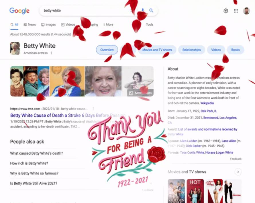 In honor of Betty White’s 100th birthday, which would have been tomorrow, January 17th, Google has covered its search page in rose petals — a nod to Rose, her beloved character from The Golden Girls.