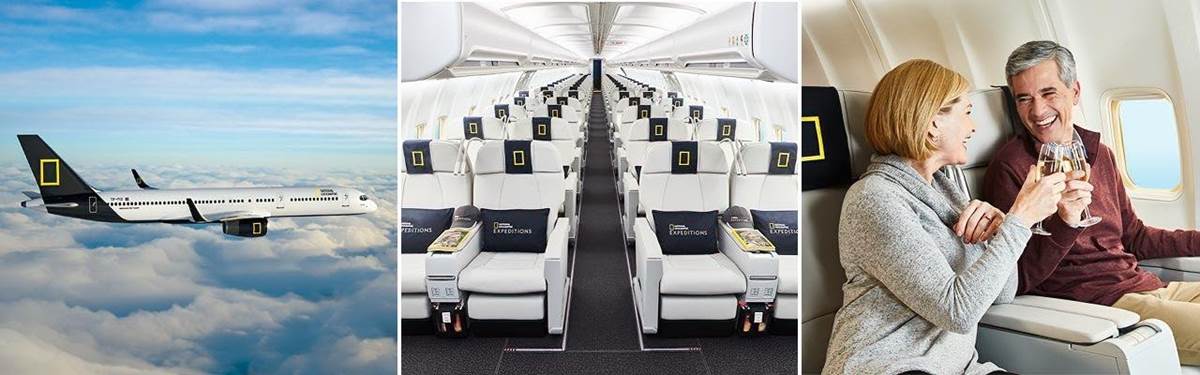 - The National Geographic jet provides flexibility and the capacity to fly direct to maximize time in each destination. Instead of the standard 233 seats, the jet's interior has been customized to accommodate 57 travelers as well as trip experts and staff.