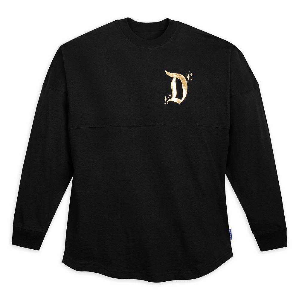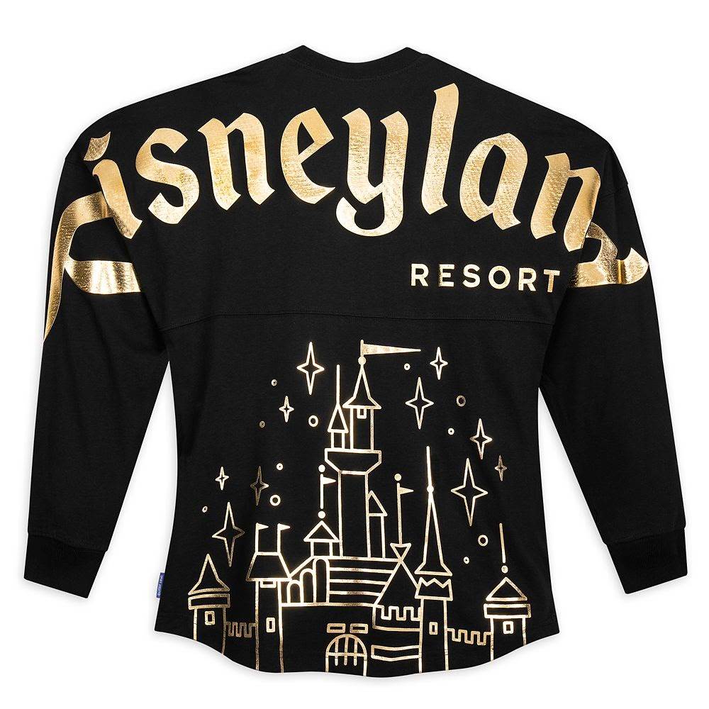 - The Spirit Jersey is all black with a gold “D” icon on the left chest, while the back features a golden outline of the iconic castle at the bottom half and a bold “Disneyland Resort” text spanning both shoulders.