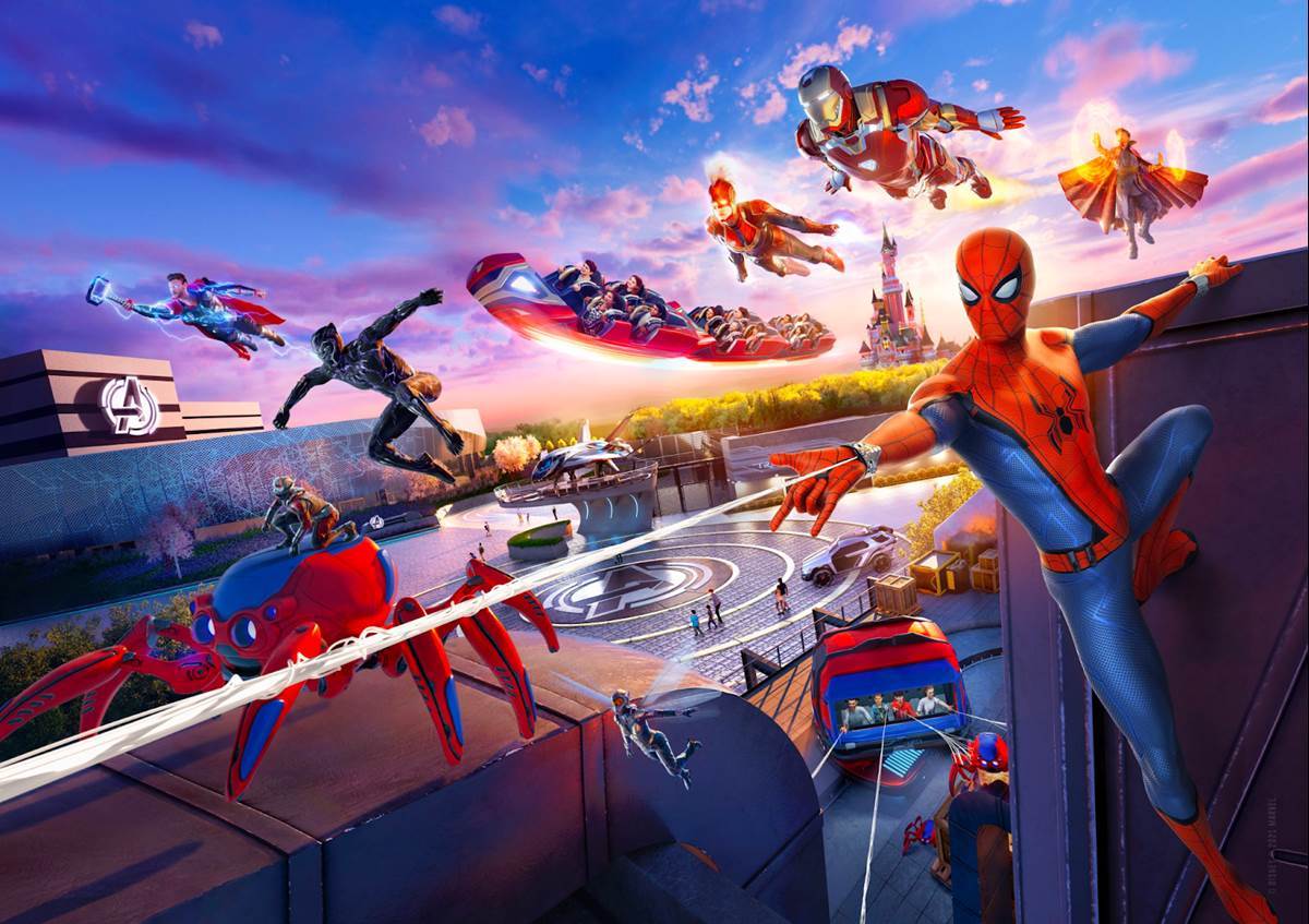 - The new key art shows several Marvel superheroes — including Spider-Man, Captain Marvel, Iron Man, Thor, Ant-Man, Wasp, Doctor Strange, and Black Panther — along with concept art for the land and attractions (with Sleeping Beauty Castle in the distance).