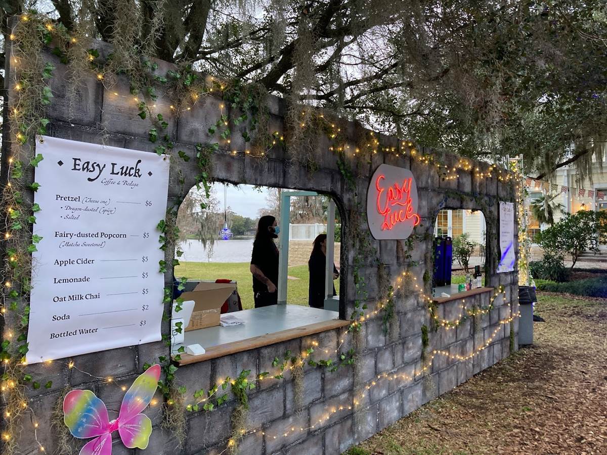 “Dragons & Fairies” is billed as an immersive theatrical adventure and that is a very fitting description. Guests who arrive early for their show can wait in a themed area just outside of the gardens, where they can enjoy some food and beverage offerings, including themed ones like a Dragon-dusted pretzel and Fairy-dusted popcorn.