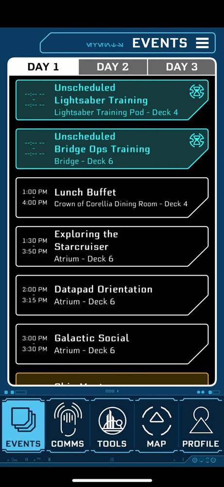 Unscheduled activities appear in blue and may be automatically scheduled 30 days prior to your arrival. Check-in and the lunch buffet is served from 1 P.M. to 4 P.M. during which time a lunch buffet is served. At the same time as the buffet is time to explore the Starcruiser, a Datapad orientation, and a Galactic Social.