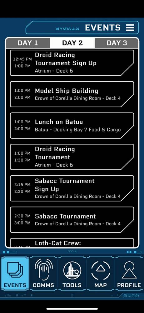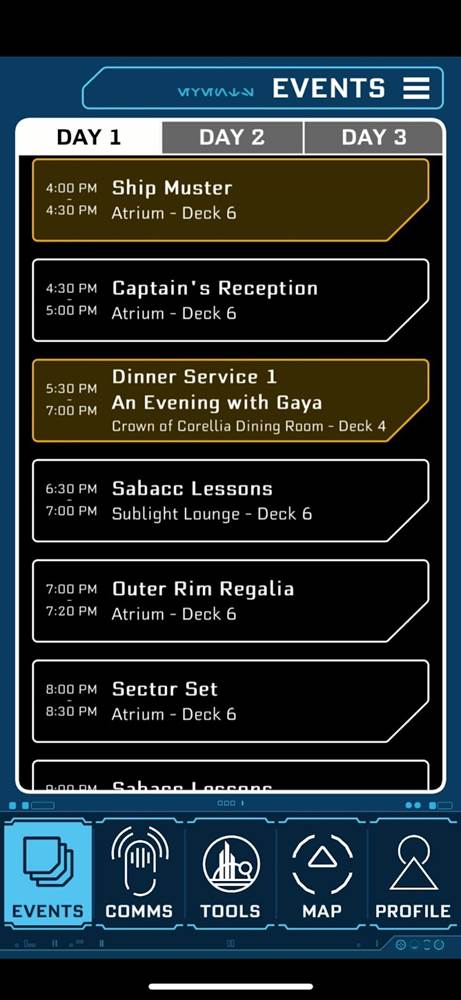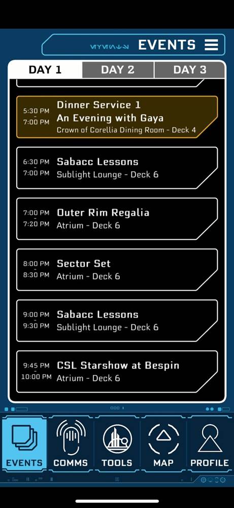 Following dinner, Sabacc Lessons are held from 6:30 P.M. to 7 P.M., Outer Rim Regalia from 7 P.M. to 7:20 P.M., Sector Set from 8 P.M. to 8:30 P.M., More Sabacc Lessons from 9 P.M. and cap off the night with the CSL Starshow at Bespin.