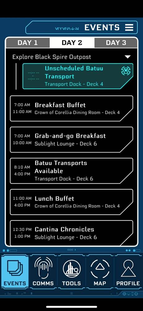 The unscheduled activity for Day 2 is a Transport to Batuu. The day starts with a Breakfast Buffet available from 7 A.M. to 11 A.M. or alternatively a Grab-and-Go Breakfast runs simultaneously from 7 A.M. to 10 A.M. Transports to Batuu will be available throughout the day from 8:10 A.M. to 4 P.M. Onboard the ship, the Lunch Buffet runs from 11:00 A.M. to 4 P.M., Cantina Chronicles takes place from 12:30 P.M. to 1 P.M.