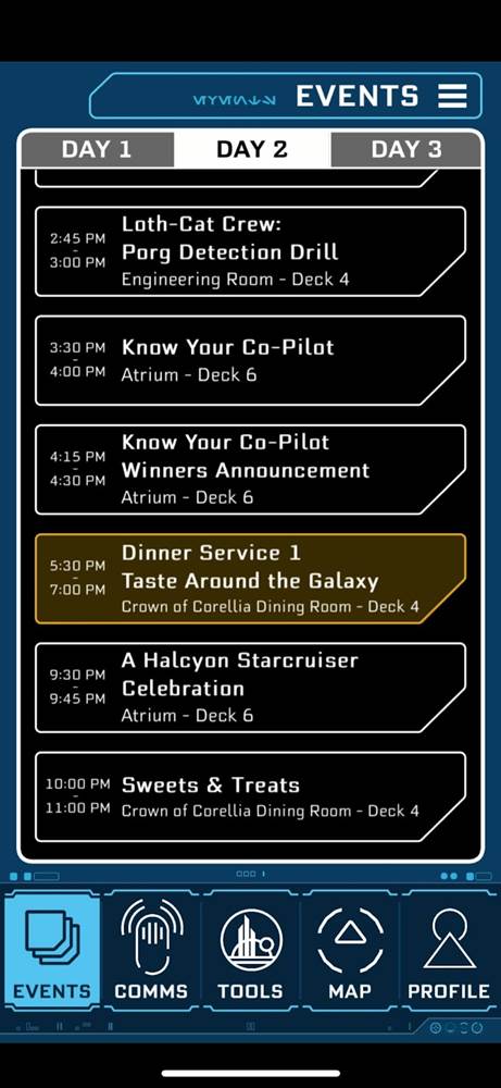 The afternoon of Day 2 continues with a fun-sounding Porg Detection Drill from 2:45 P.M. to 3 P.M., first dinner service between 5:30 P.M. and 7 P.M. at the Crown of Corellia Dining Room and A Halcyon Starcruiser Celebration from 9:30 P.M. to 9:45 P.M.