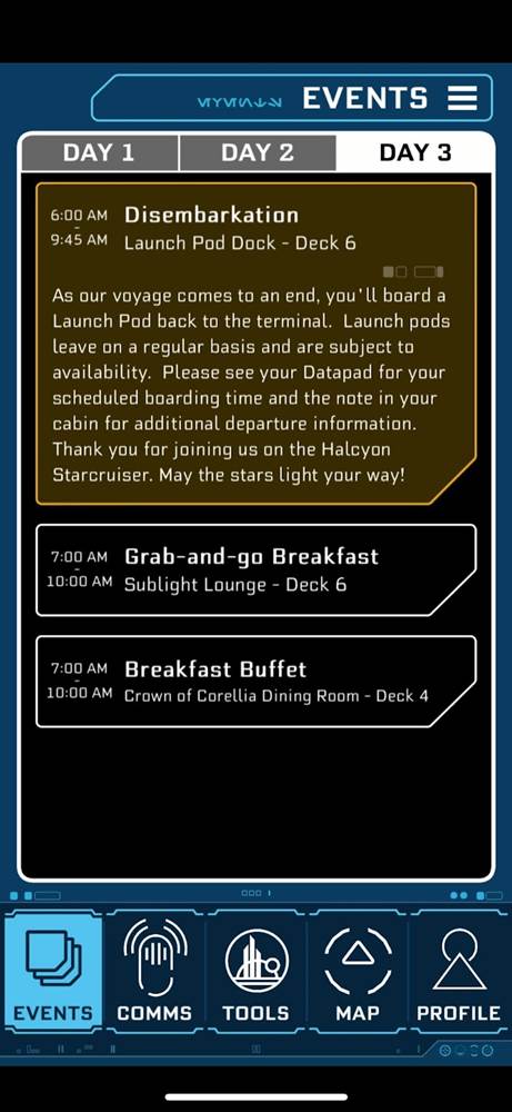 Day 3 is Disembarkation day, so there’s not as much going on as the previous days. At the end of your voyage, you’ll board a Launch Pod back to the terminal. Your Datapad will give you your scheduled boarding time. Both grab-and-go and buffet breakfast options will be available from 7 A.M. to 10 A.M.