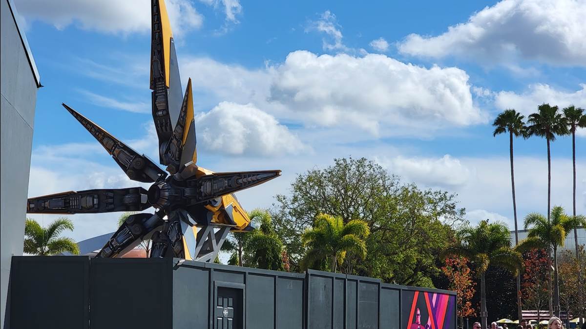 Earlier today, Walt Disney Imagineering Show Set Designer Kevin Doxey showcased a look behind the construction walls at the installation of the Nova Corps Starblaster in front of the new attraction.