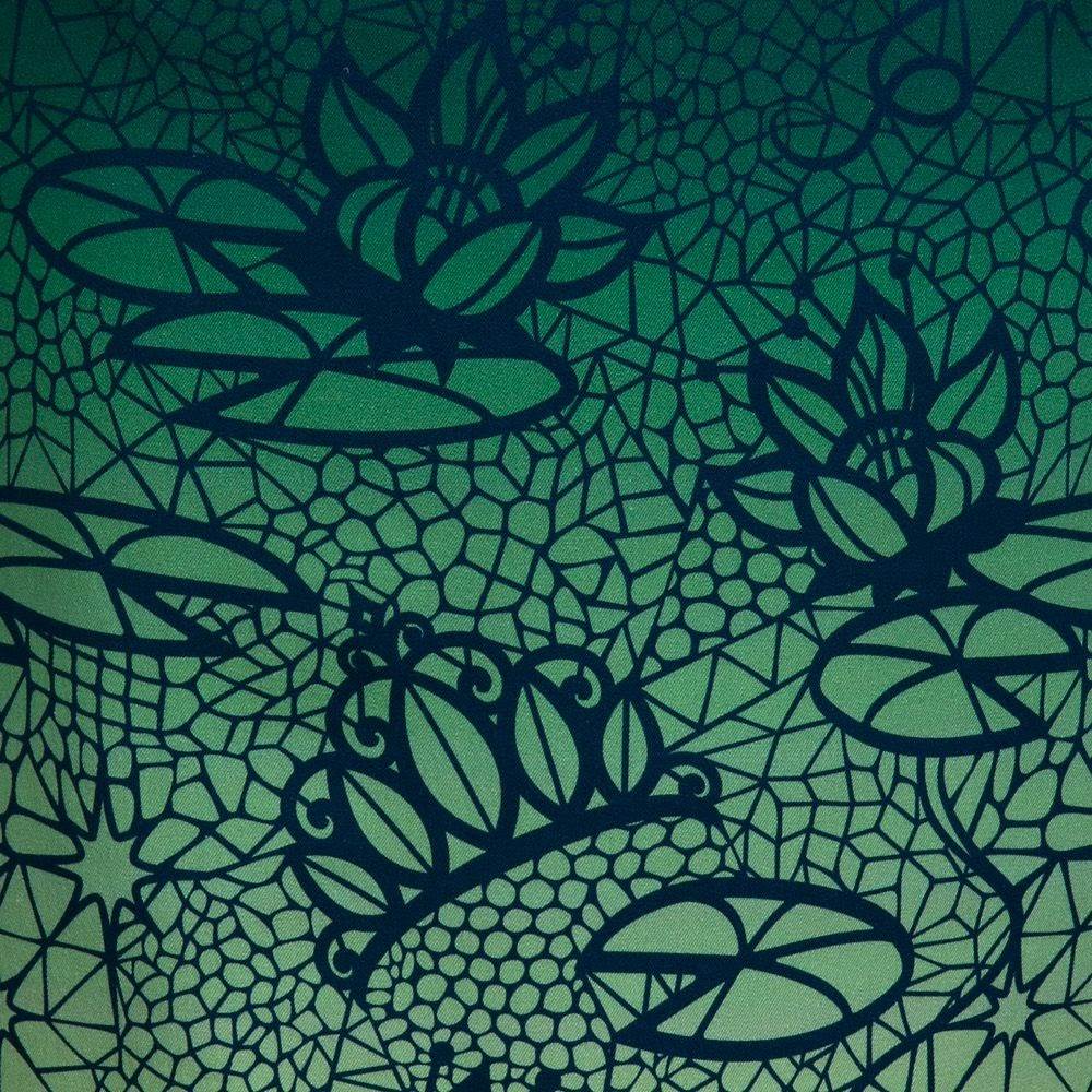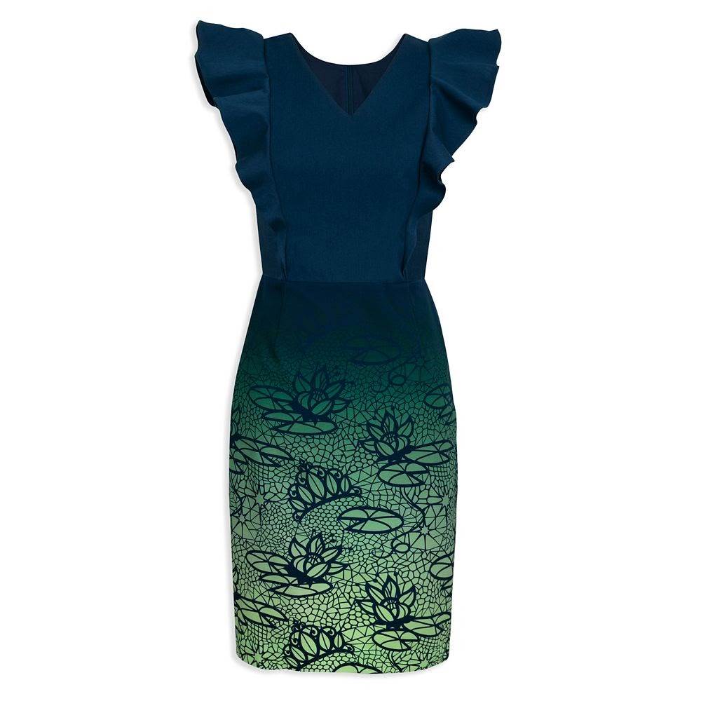 - Adding to its charm is the ombre coloring that transitions from a deep navy blue at the top to an emerald green and finally a soft lime green. Lily pad and tiaras make up the dress’ pattern and subtly acknowledge the inspiration behind the look.