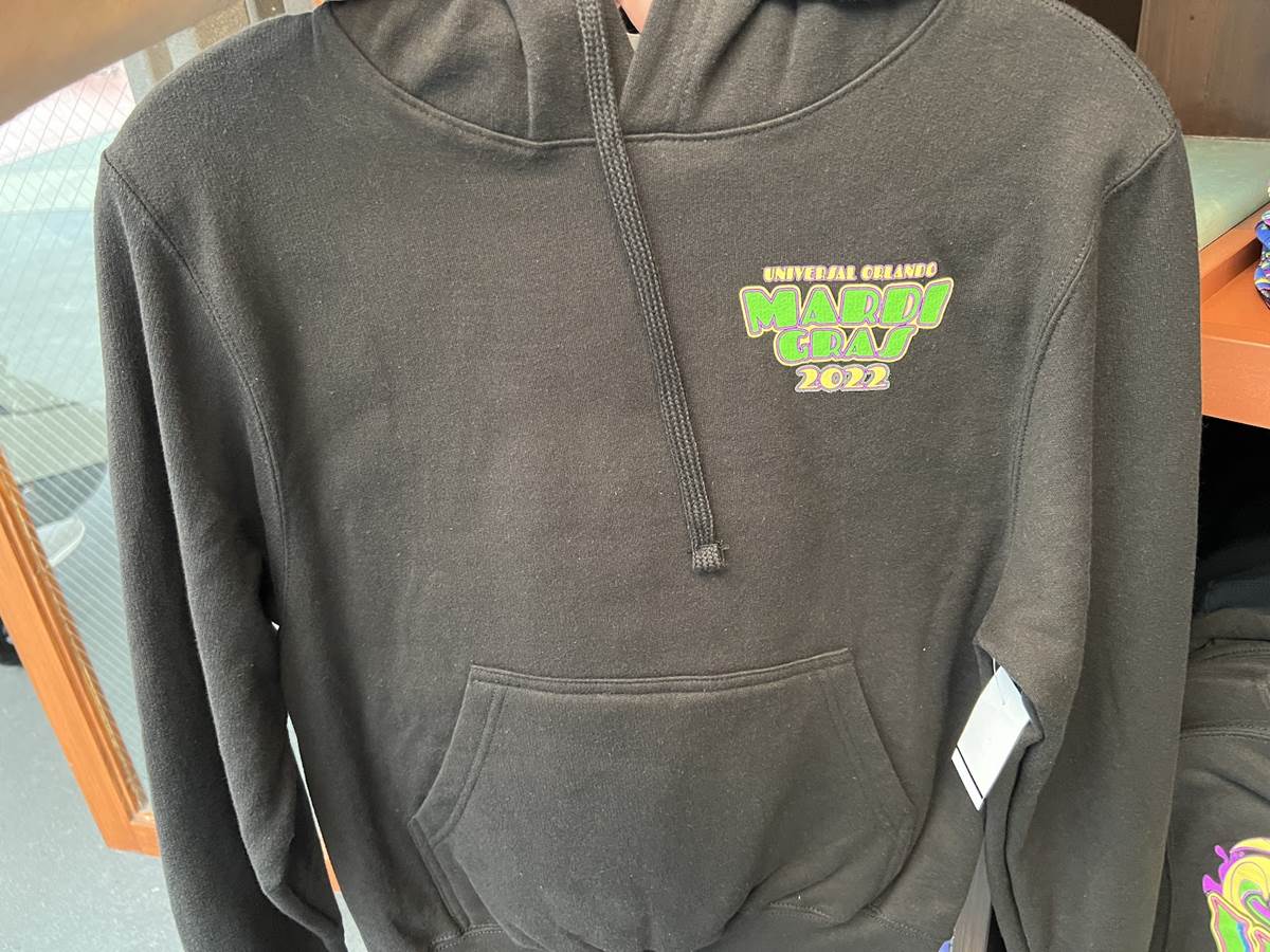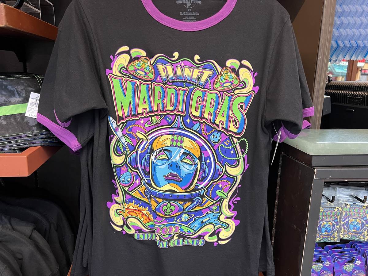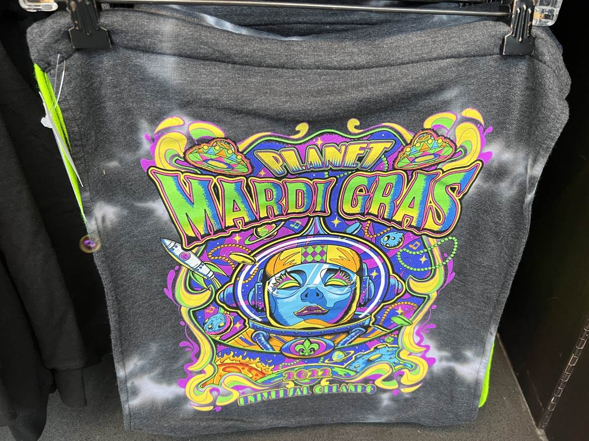 To celebrate this year’s parade you’ll find plenty of merchandise with the Planet Mardi Gras artwork, adorned on cinch-bags, t-shirts, pins, hoodies, and more. We spotted this collection of Mardi Gras Merchandise at the store located at the exit of The Bourne Stuntacular, still referred to as Cyber Image on the Universal App. The name is a remnant of the Terminator 2: 3-D attraction that would exit into the store. Though we spotted this selection at this specific location, Mardi Gras Merchandise is sold throughout Universal Studios Florida and beyond, with a Mardi Gras Voodoo Boutique also located at neighboring Islands of Adventure.