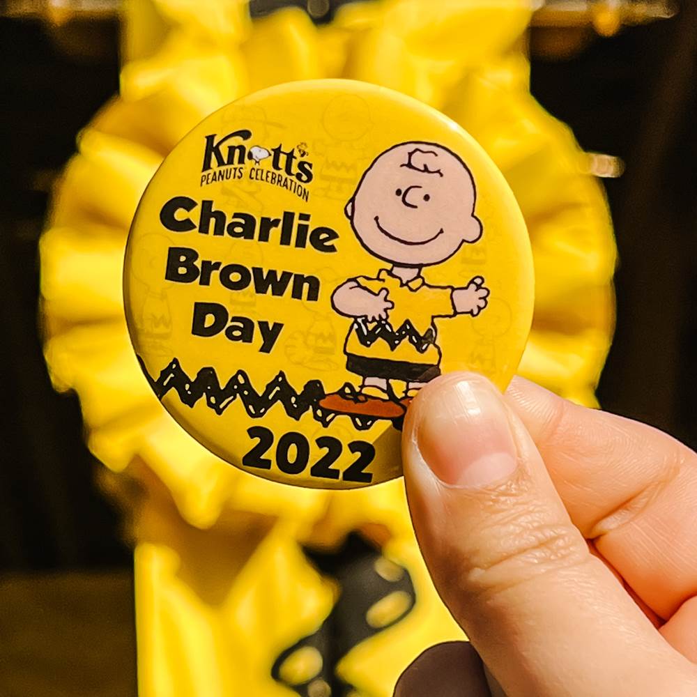 - Knott’s will be giving away this special Charlie Brown Day button to guests at the main entrance today, while supplies last.