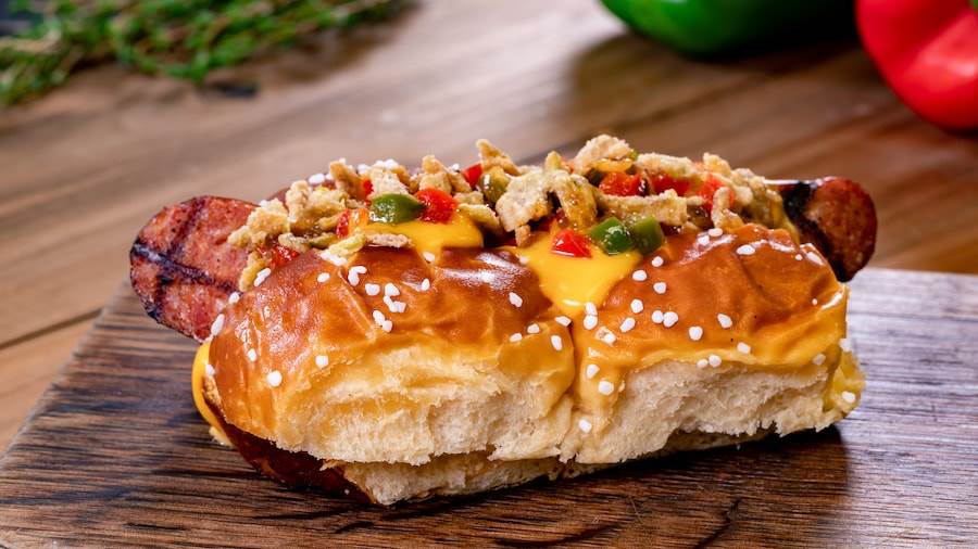 - IPA Sausage Dog on a soft pretzel roll with onion-pepper Jardinière, cheddar cheese sauce, and malt vinegar-jalapeño crunch (available with Sip & Savor Pass) (New)