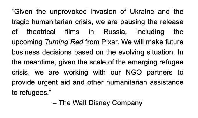 - In the tweet, the statement from the Walt Disney Company reads: “Given the unprovoked invasion and the tragic humanitarian crisis, we are pausing the release of theatrical films in Russia, including the upcoming Turning Red from Pixar. We will make future business decisions based on the evolving situation. In the meantimes, given the scale of the emerging refugee crisis, we are working with our NGO partners to provide urgent aid and other humanitarian assistance to refugees. - The Walt Disney Company”