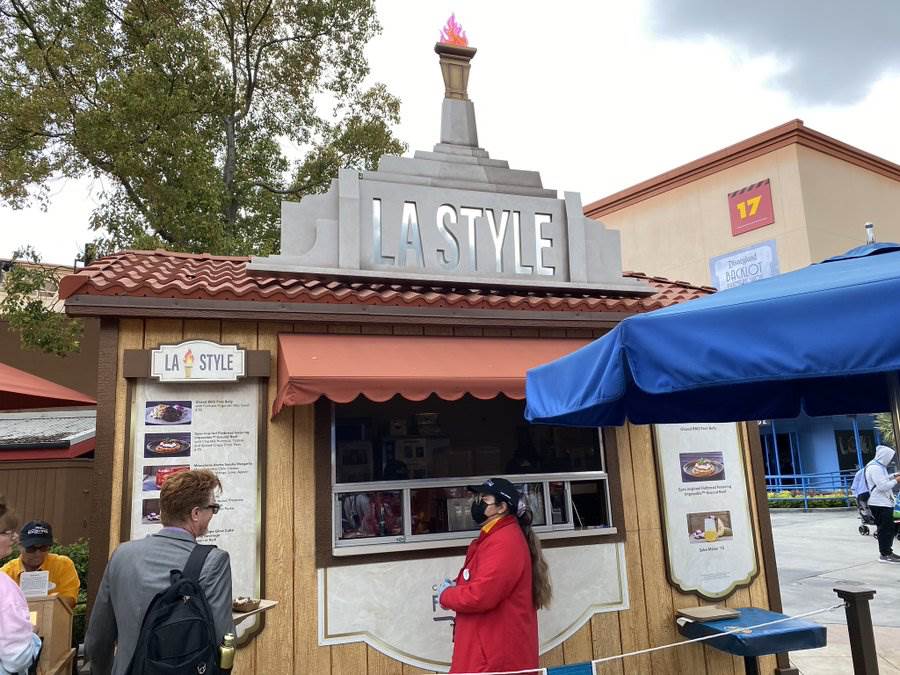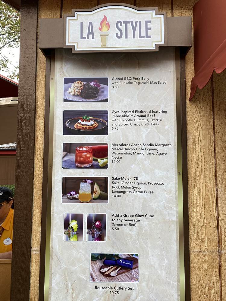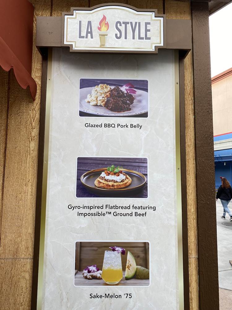 Over in the Hollywood Backlot, “LA Style” features BBQ pork belly, Impossible beef flatbread, a margarita, and a sake-melon drink.
