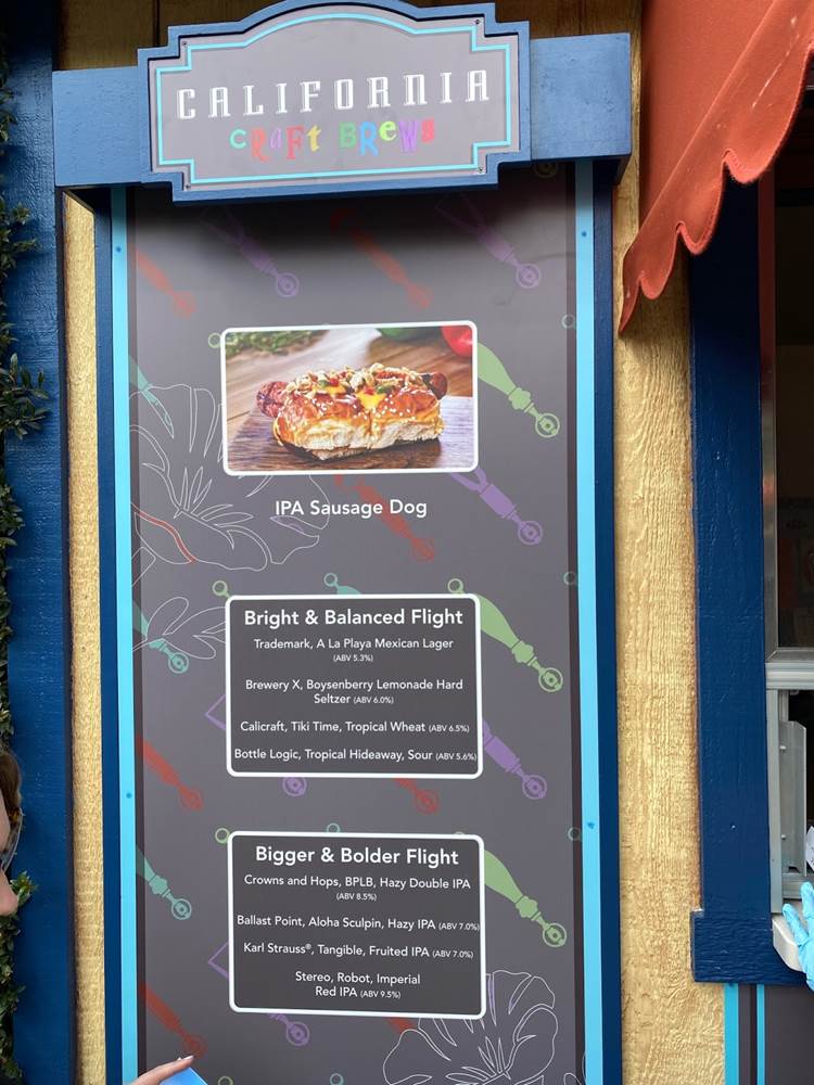 “California Craft Brews” features an IPA sausage dog and a selection of alcoholic beverages.
