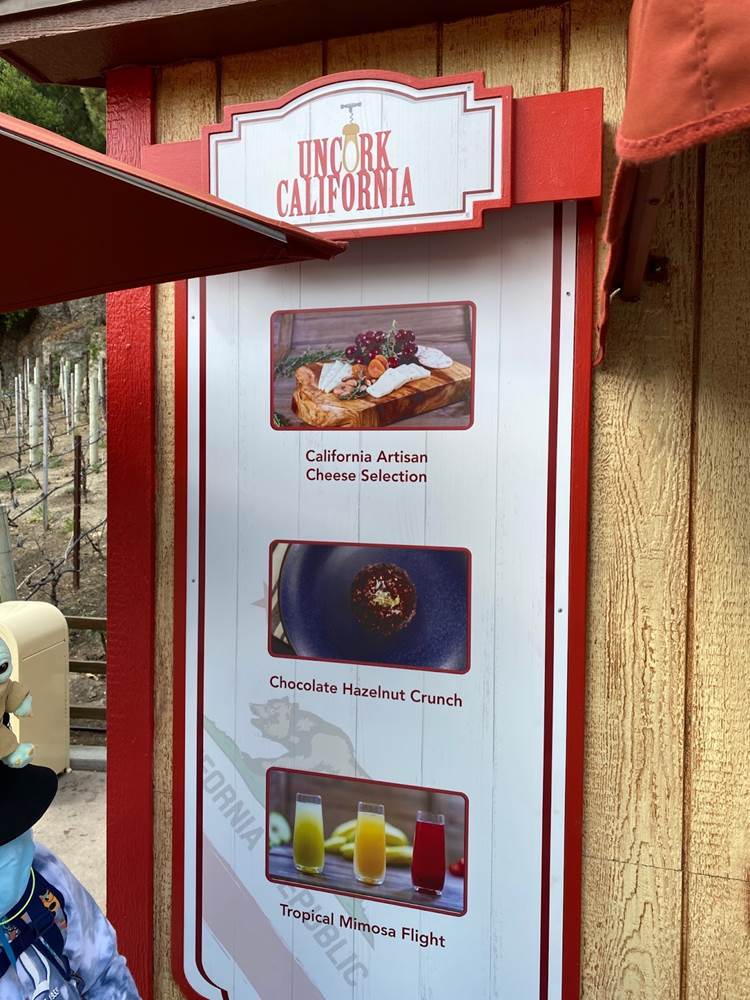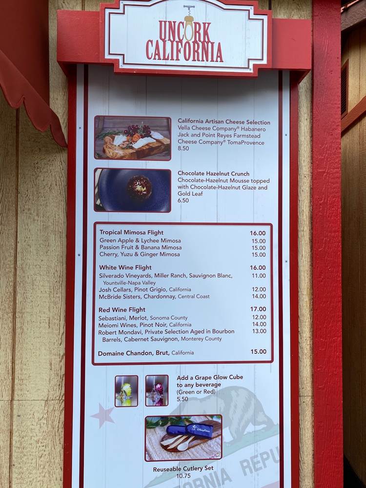 “Uncork California” has an artisan cheese selection, chocolate hazelnut crunch, a tropical mimosa flight, and other wine flights.
